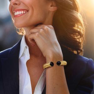 Onyx and .30 ct. t.w. White Topaz C-Hoop Earrings in 18kt Gold Over Sterling. 3/4″