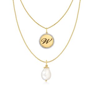 18kt Gold Over Sterling Layered Initial Necklace with 11-12mm Cultured Baroque Pearl and Diamonds