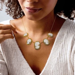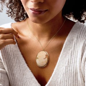 C. 1920 Vintage Brown Shell Cameo Necklace in 20kt Yellow Gold. 18″