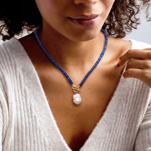 13-15mm Cultured Baroque Pearl and 4.5-5mm Lapis Bead Toggle Necklace in 18kt Gold Over Sterling