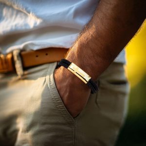 Men’s Yellow Stainless Steel Cross Bracelet with Black Leather. 8″