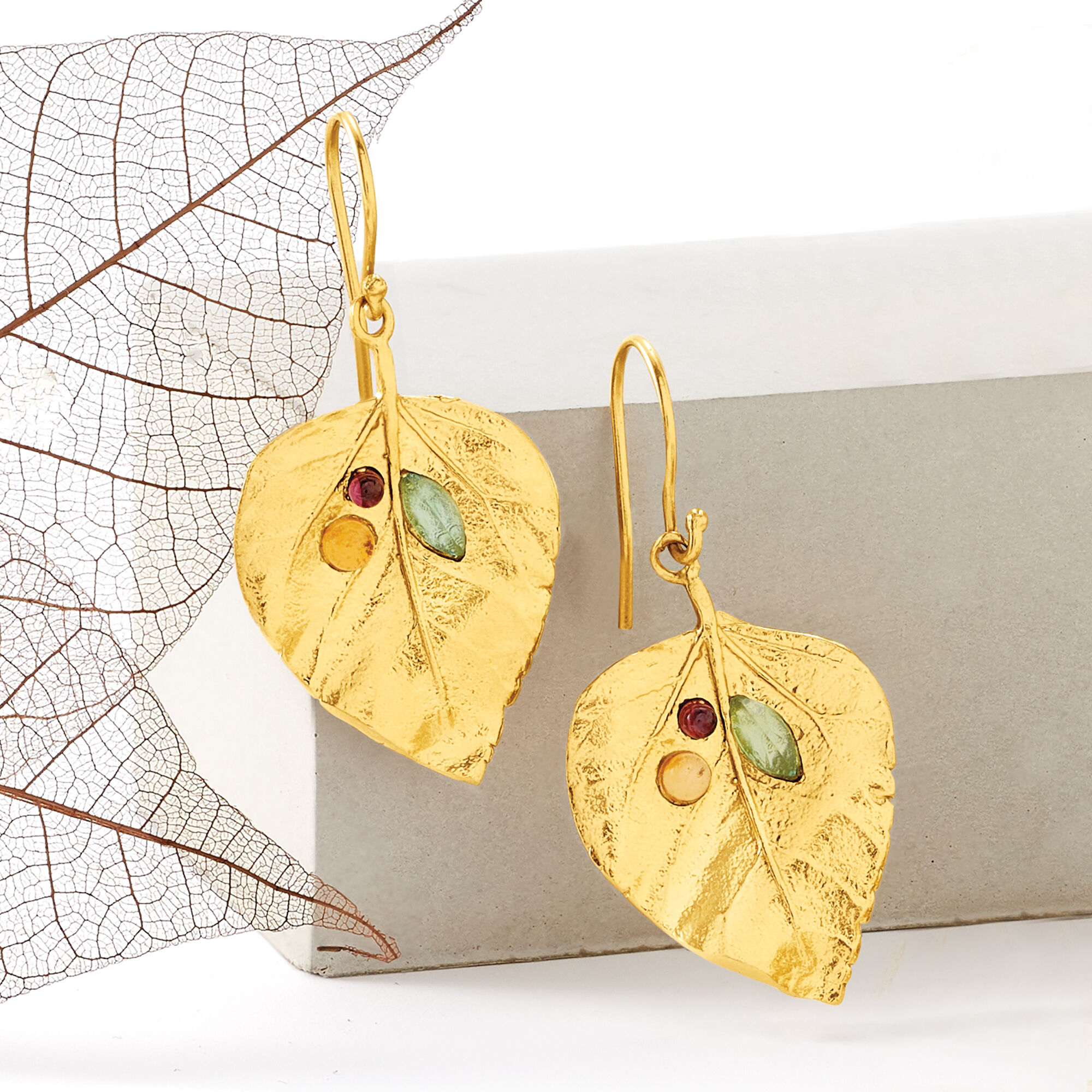 1.40 ct. t.w. Multi-Gemstone Leaf Drop Earrings in 18kt Yellow Gold Over Sterling