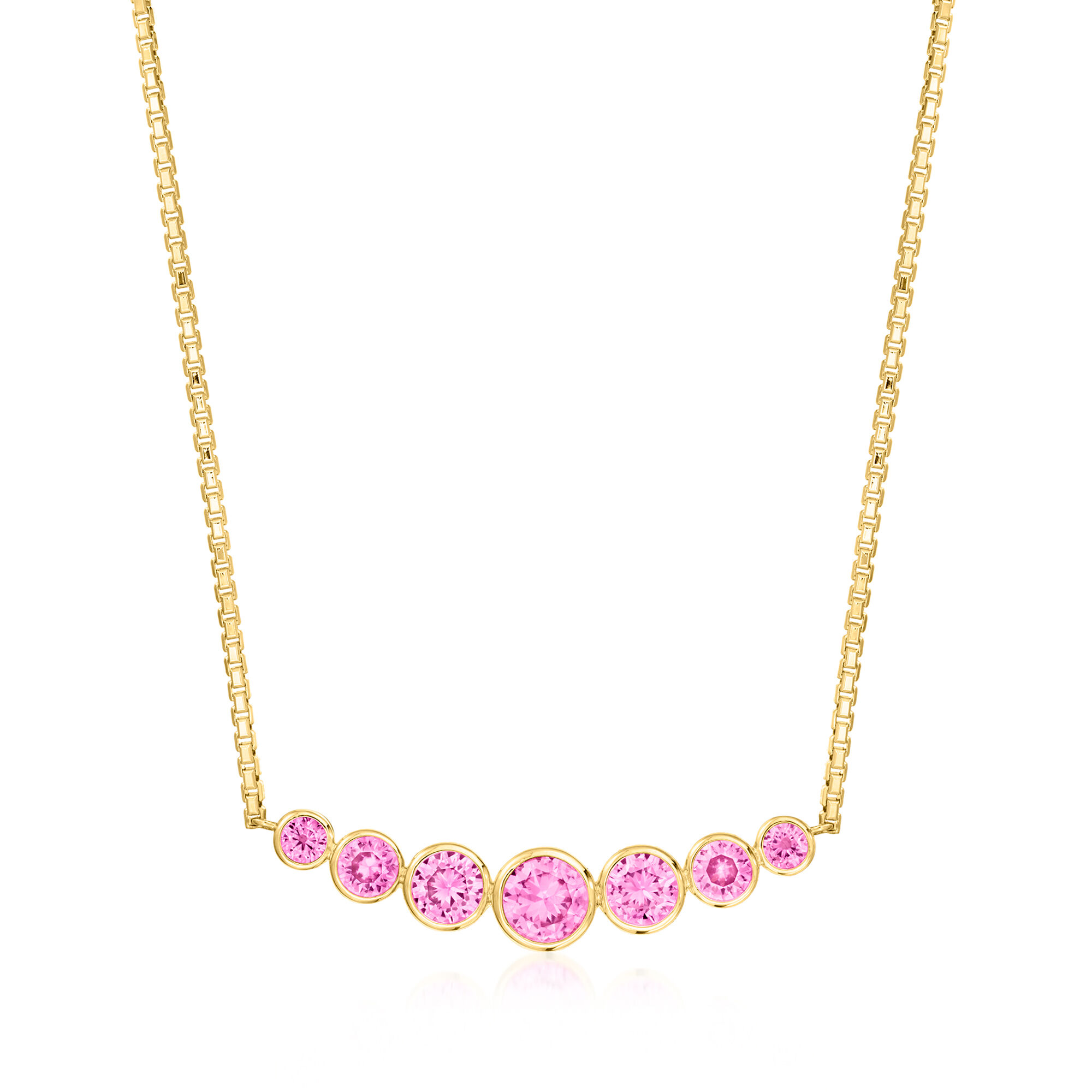 1.60 ct. t.w. Graduated Bezel-Set Lab-Grown Pink Sapphire Curved Bar Necklace in 18kt Gold Vermeil. 16″
