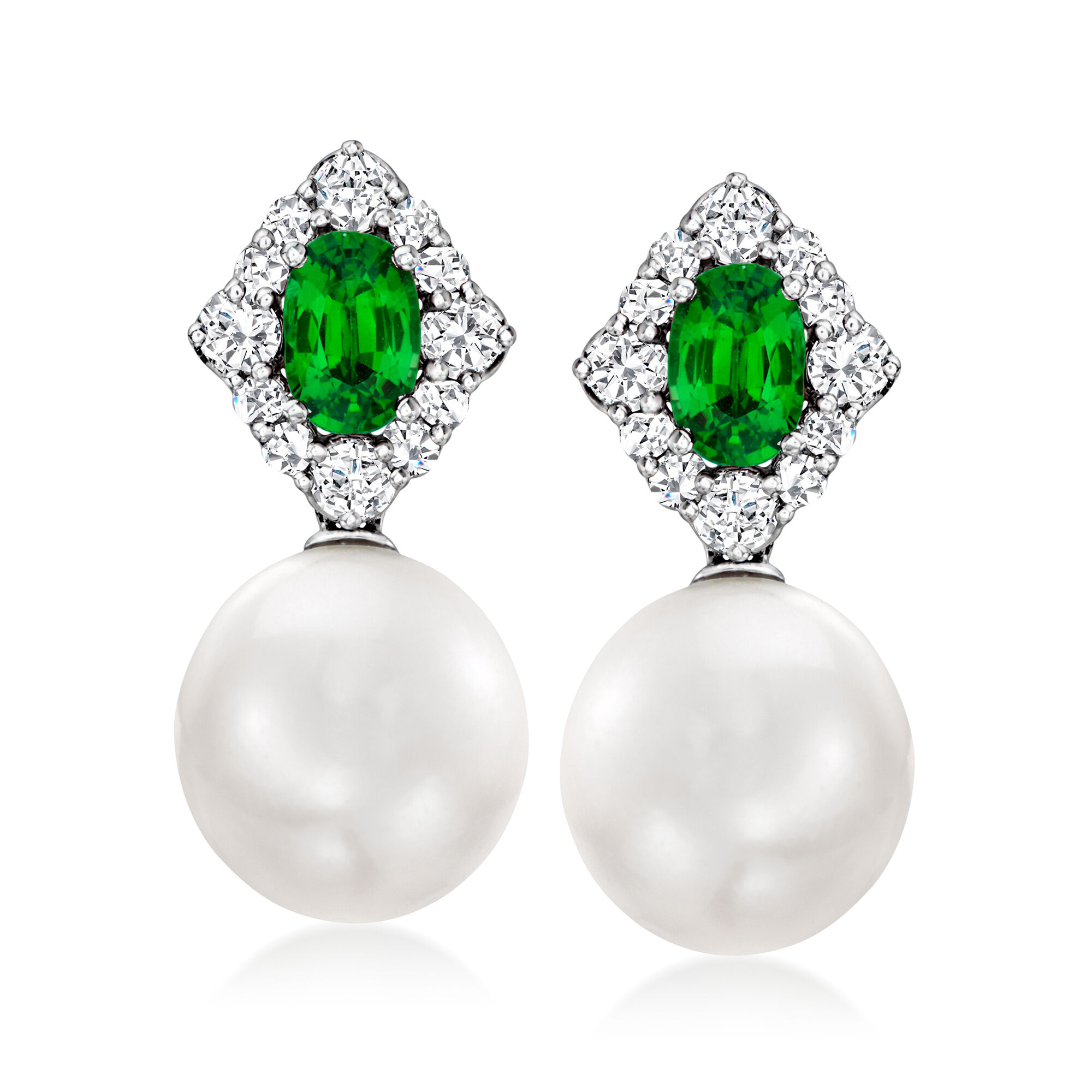 10-10.5mm Cultured South Sea Pearl Drop Earrings with .90 ct. t.w. Emeralds and .66 ct. t.w. Diamonds in 18kt White Gold