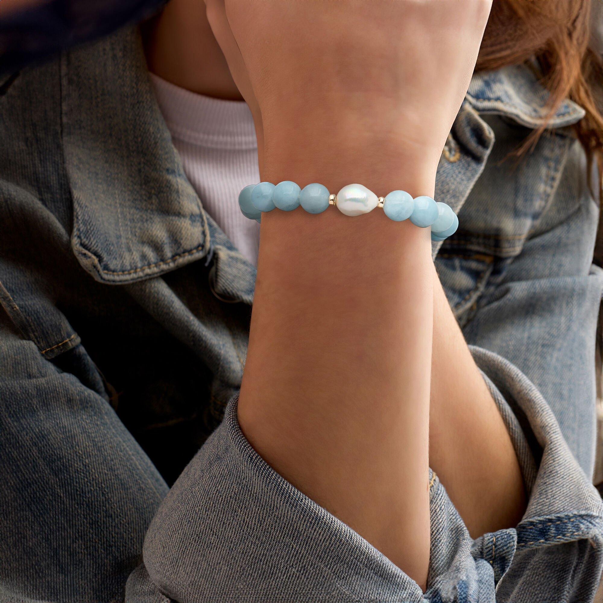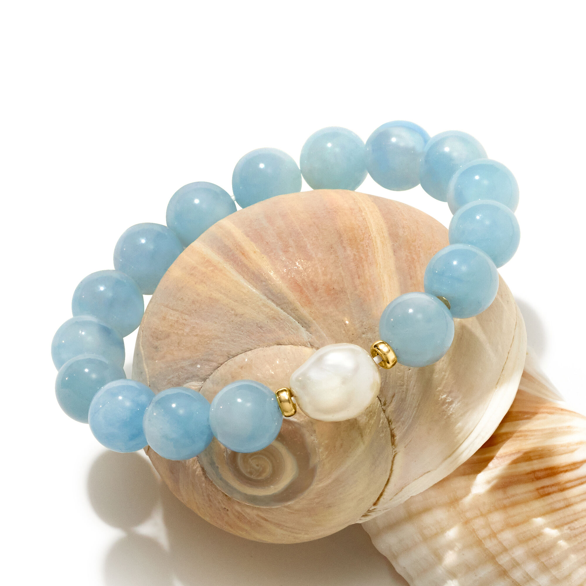 12-13mm Cultured Baroque Pearl and 140.00 ct. t.w. Aquamarine Bead Stretch Bracelet with 14kt Yellow Gold. Adjustable Size