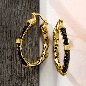 15.00 ct. t.w. Black Spinel Bead Hoop Earrings in 18kt Gold Over Sterling. 1 3/4″