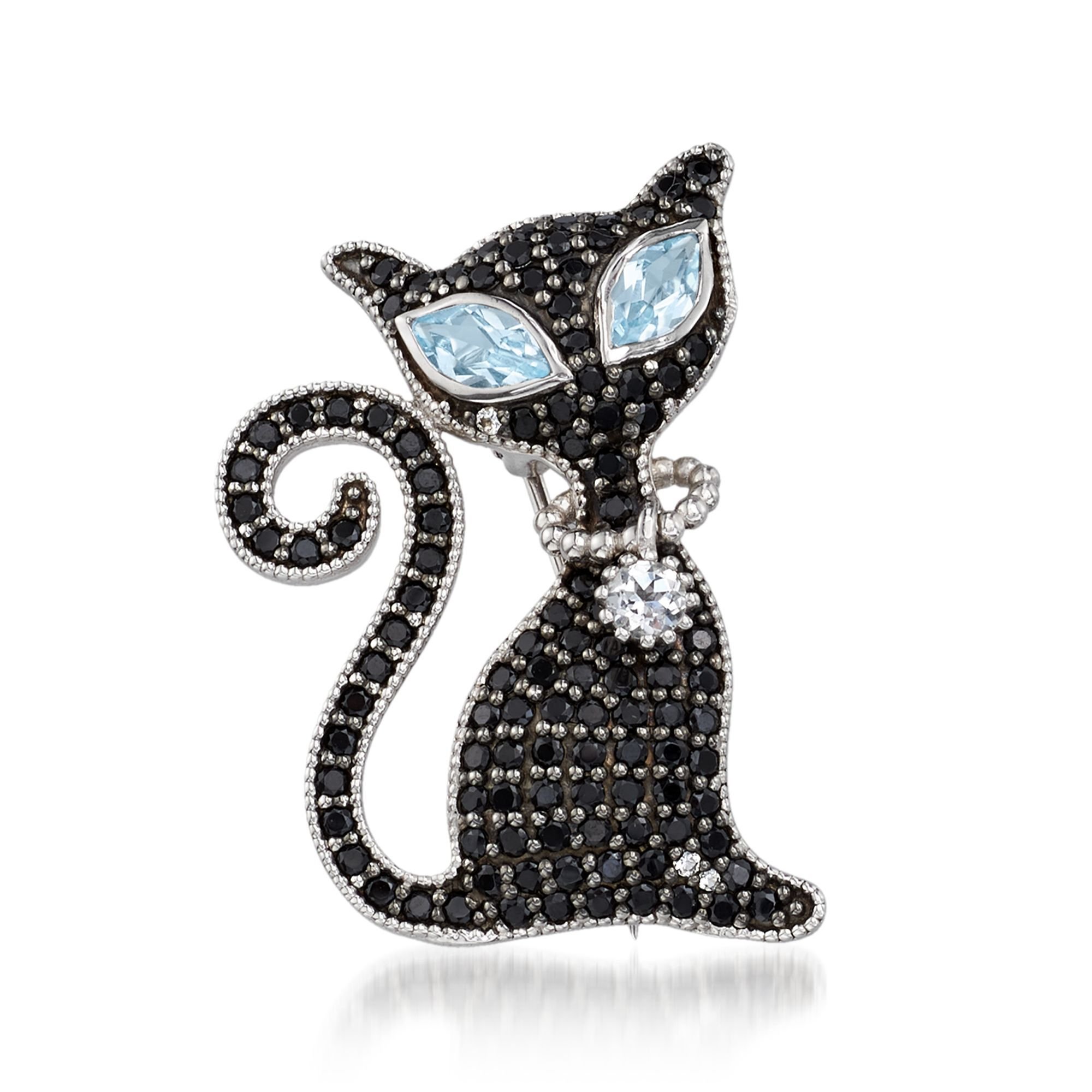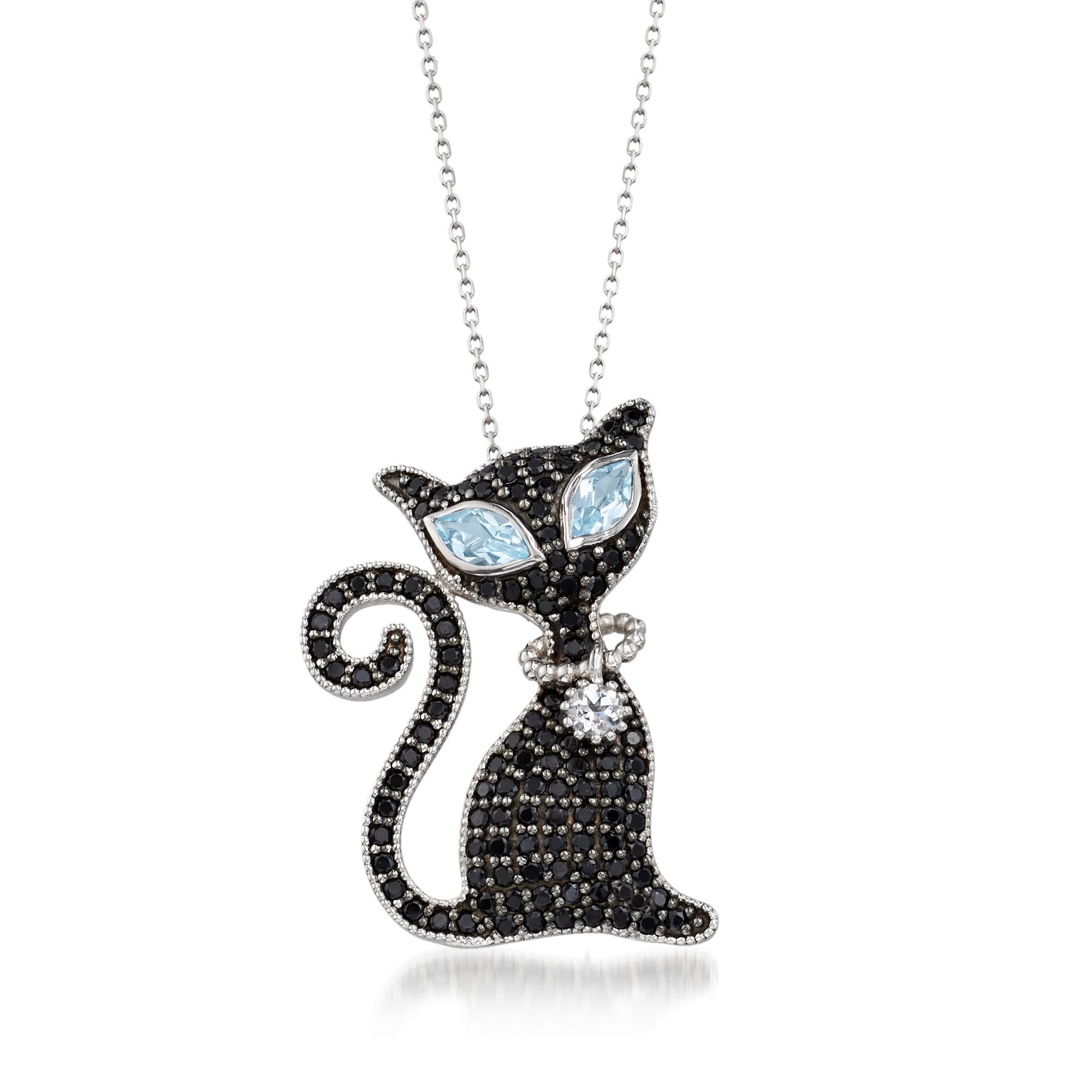 2.00 ct. t.w. Black Spinel and 1.60 ct. t.w. Sky Blue and White Topaz Cat Pin/Pendant Necklace in Sterling