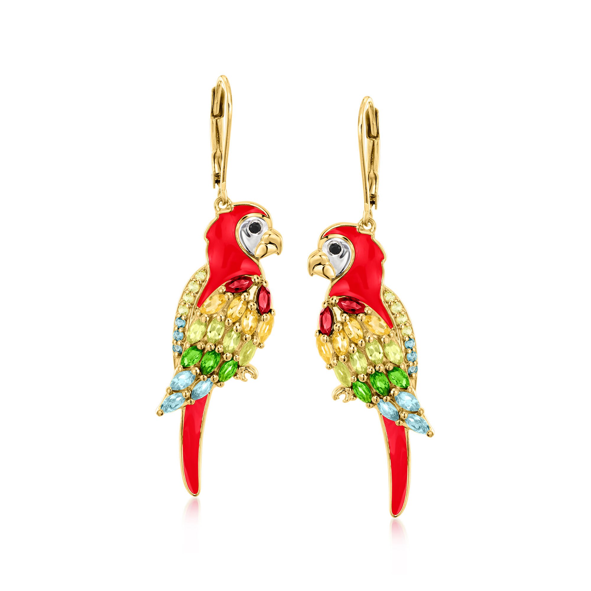 2.33 ct. t.w. Multi-Gemstone Parrot Drop Earrings with Red Enamel in 18kt Gold Over Sterling