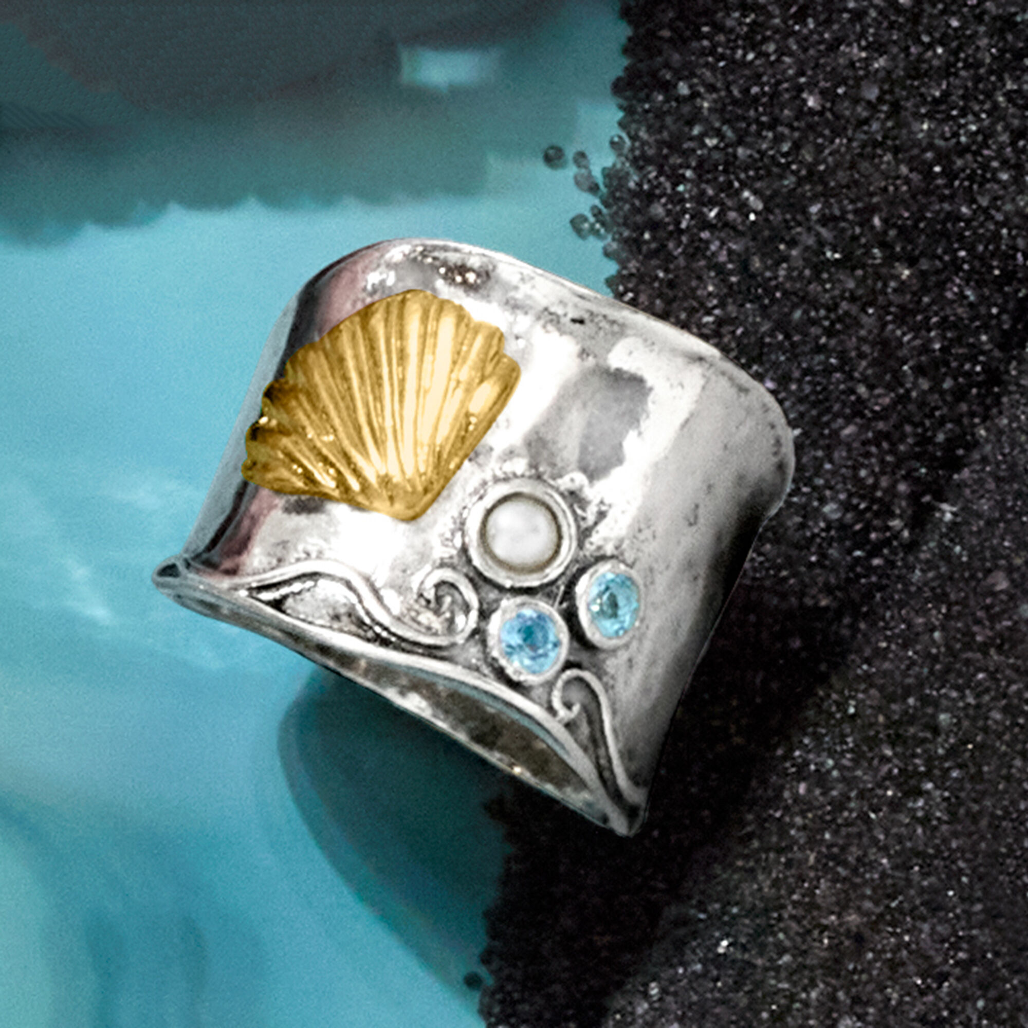 2.75-3mm Cultured Pearl and .10 ct. t.w. Swiss Blue Topaz Shell Ring in Sterling Silver and 18kt Gold Over Sterling