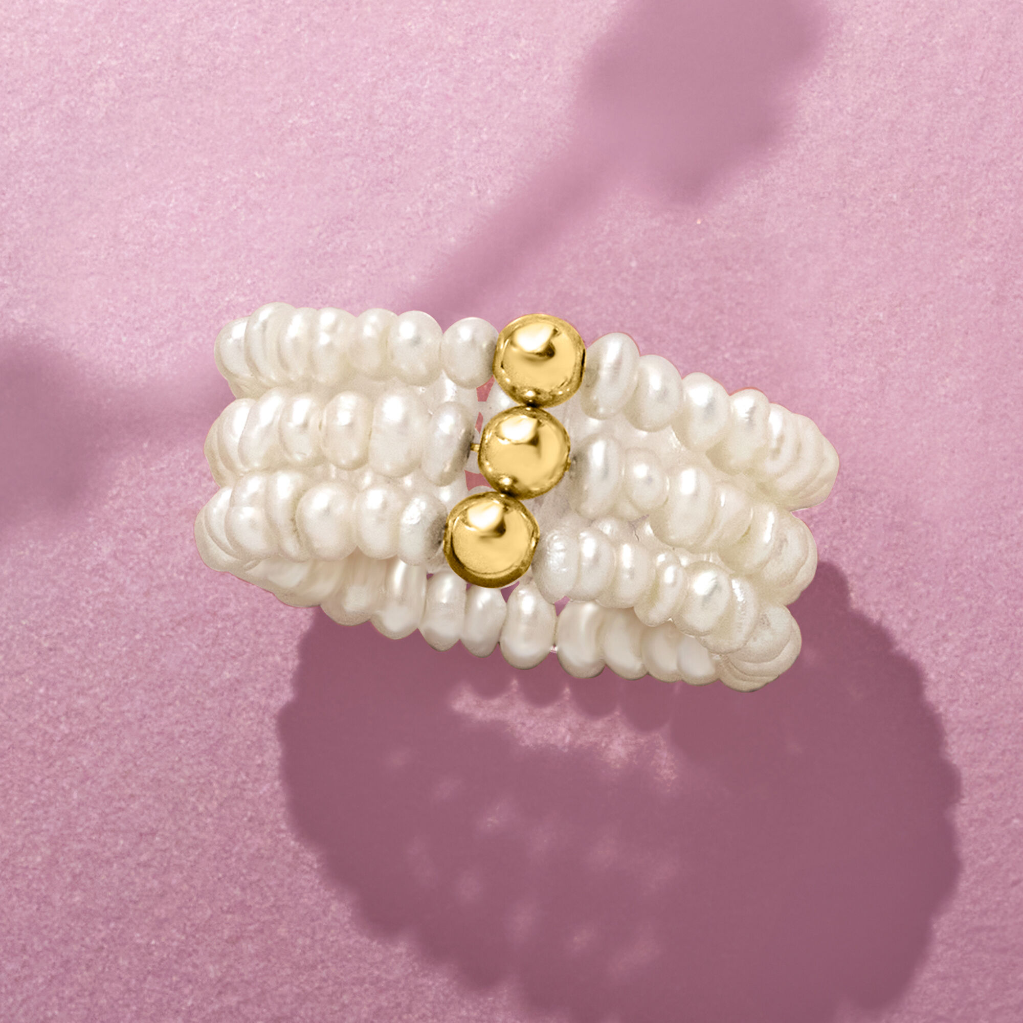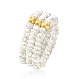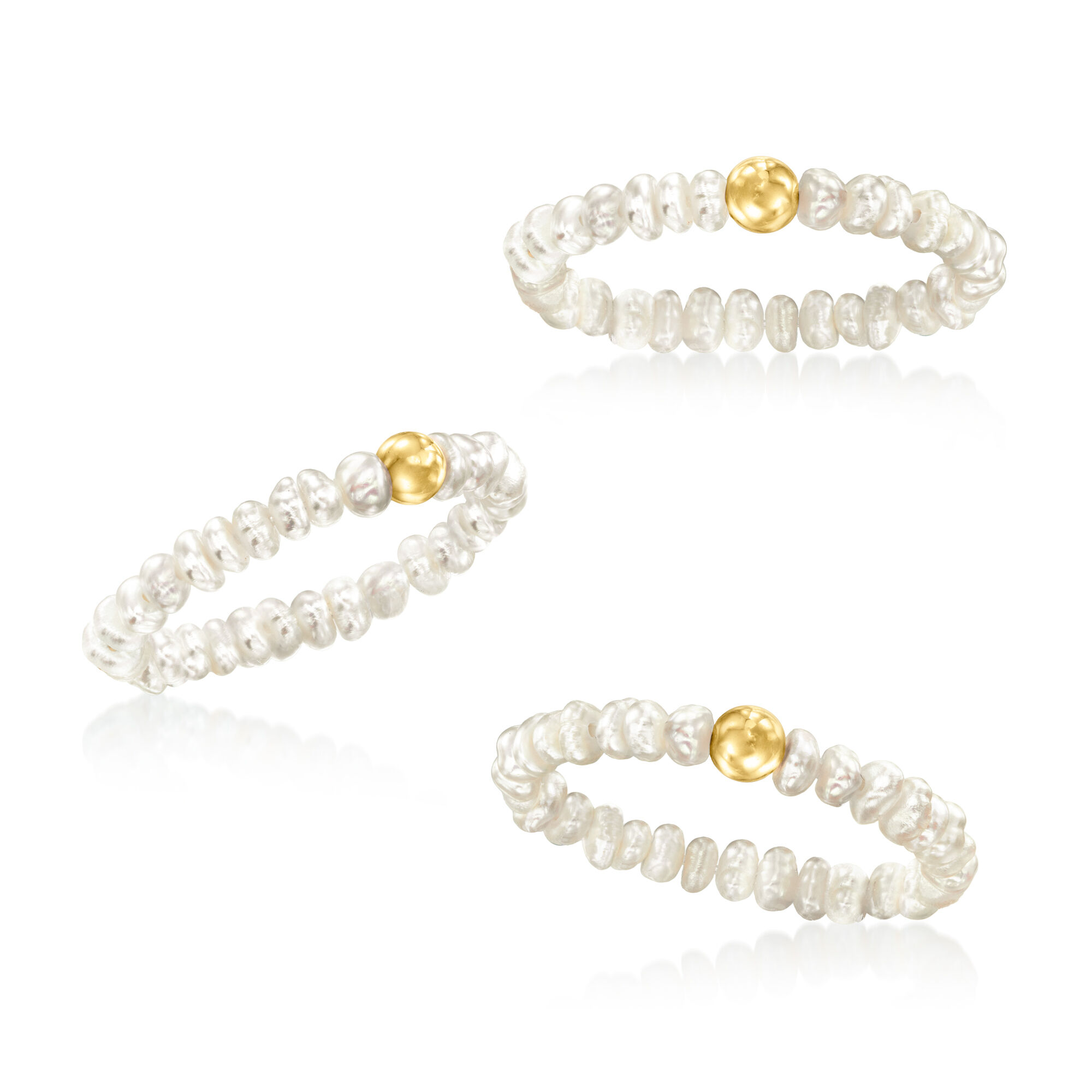 3-4mm Cultured Pearl Jewelry Set: Three Stretch Rings with 14kt Yellow Gold