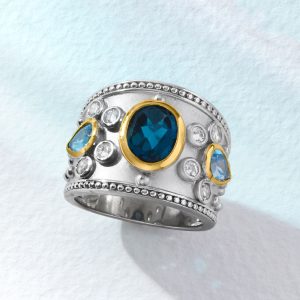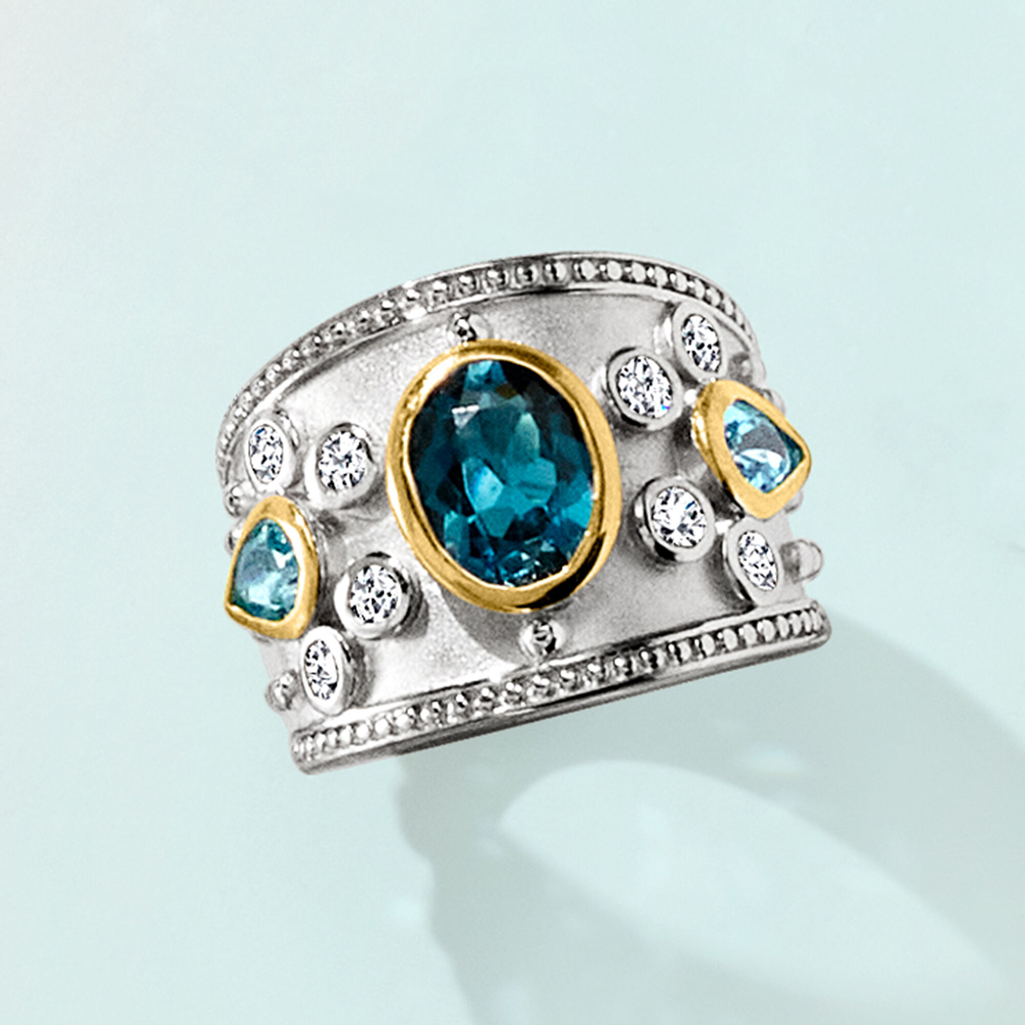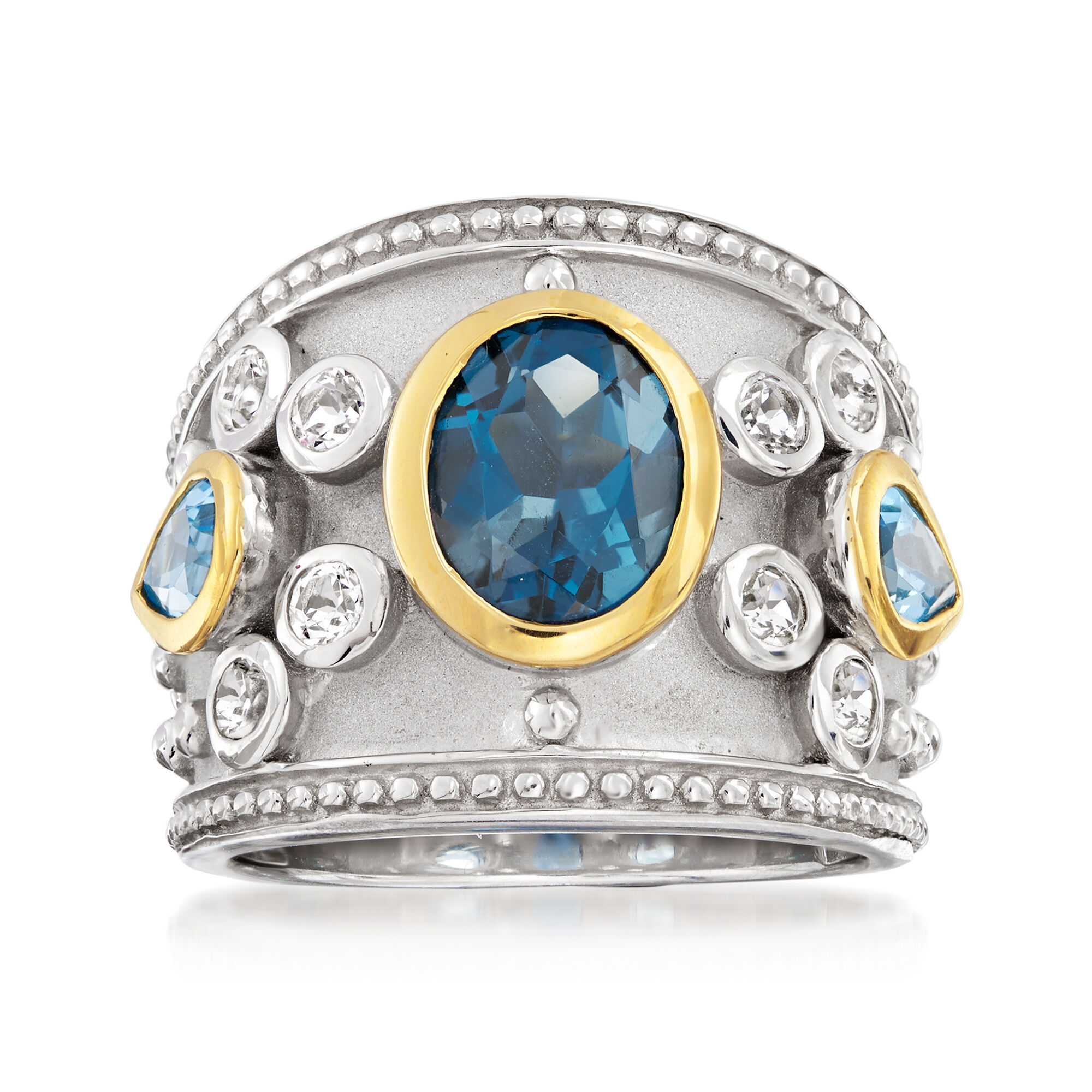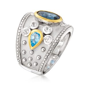 3.70 ct. t.w. London Blue, Swiss Blue and White Topaz Ring in Sterling Silver with 14kt Yellow Gold