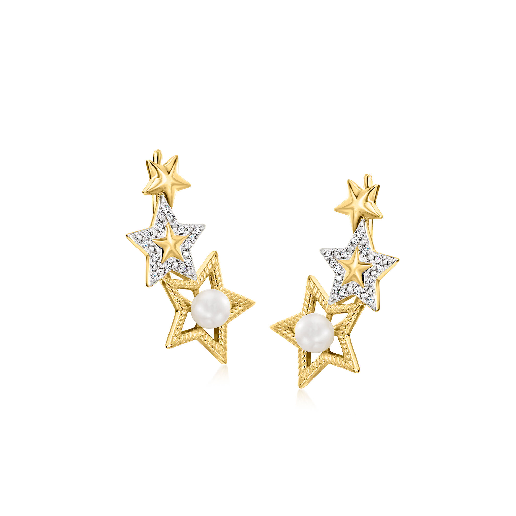 4-4.5mm Cultured Pearl Star Ear Climbers with Diamonds in 18kt Gold Over Sterling