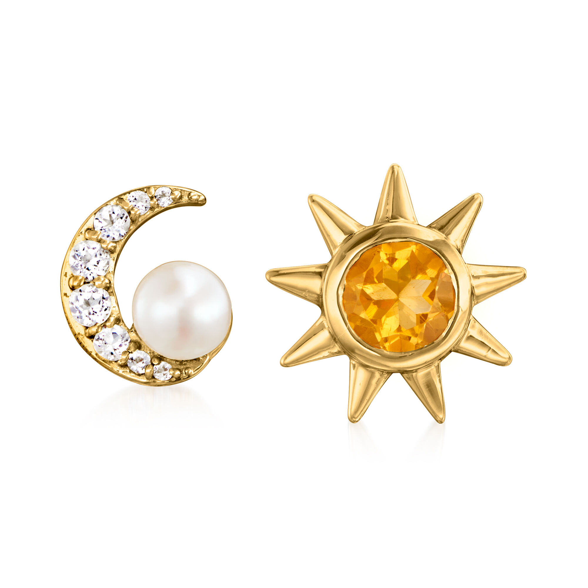 4mm Cultured Pearl and .60 ct. t.w. Multi-Gemstone Sun and Moon Mismatched Earrings in 18kt Gold Over Sterling