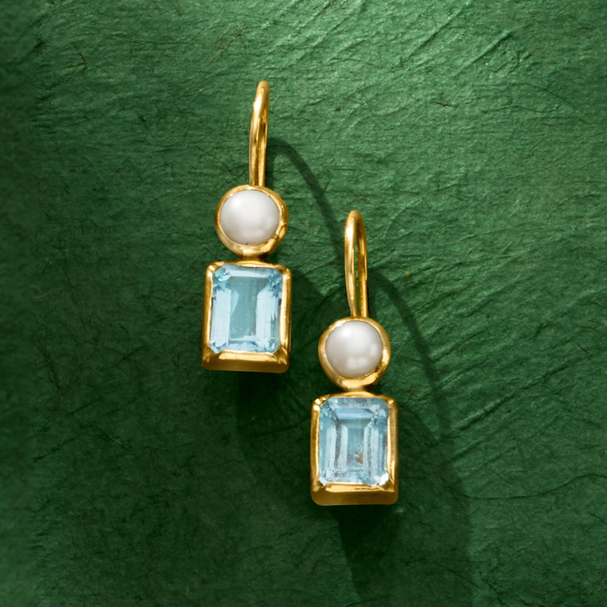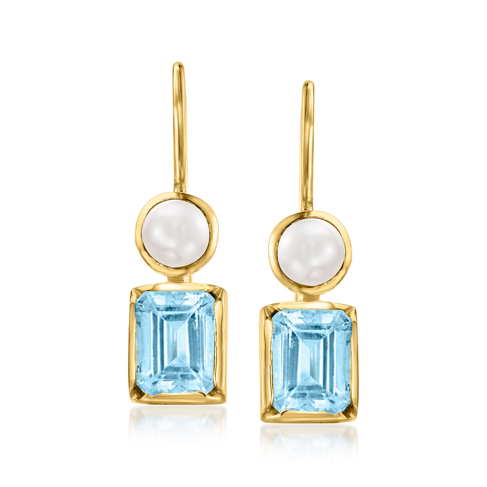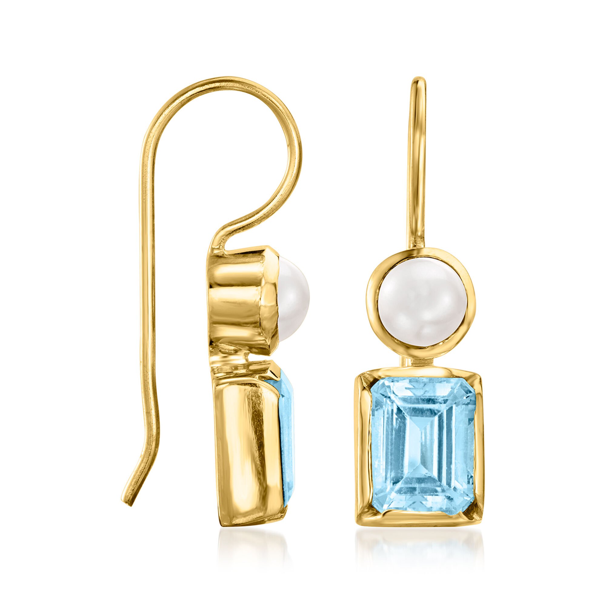 5mm Cultured Pearl and 3.40 ct. t.w. Sky Blue Topaz Drop Earrings in 18kt Gold Over Sterling