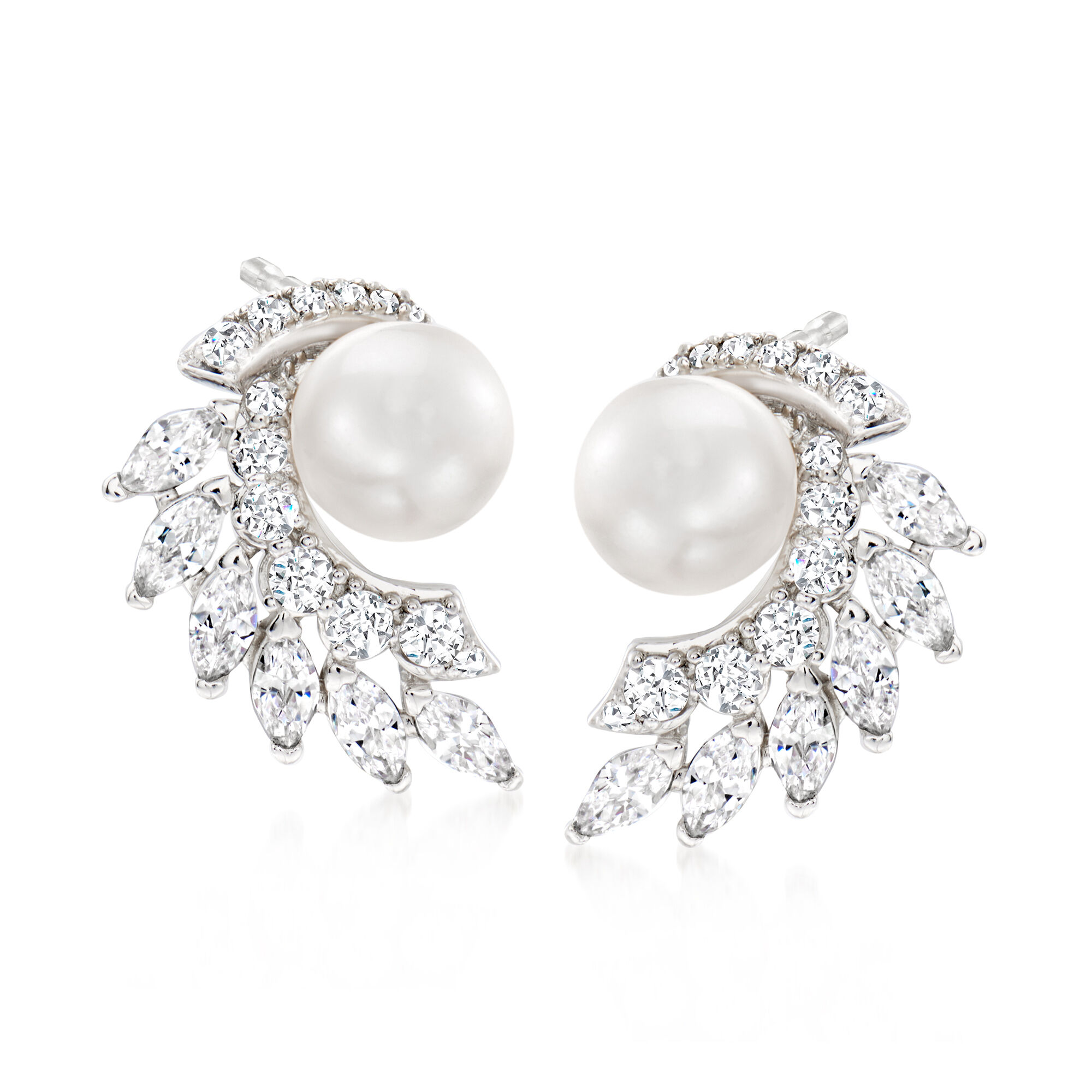 6.5-7mm Cultured Pearl and 1.50 ct. t.w. CZ Curved Cluster Earrings in Sterling Silver