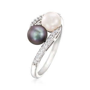 6-6.5mm Black and White Cultured Pearl and .13 ct. t.w. Diamond Bypass Ring in Sterling Silver