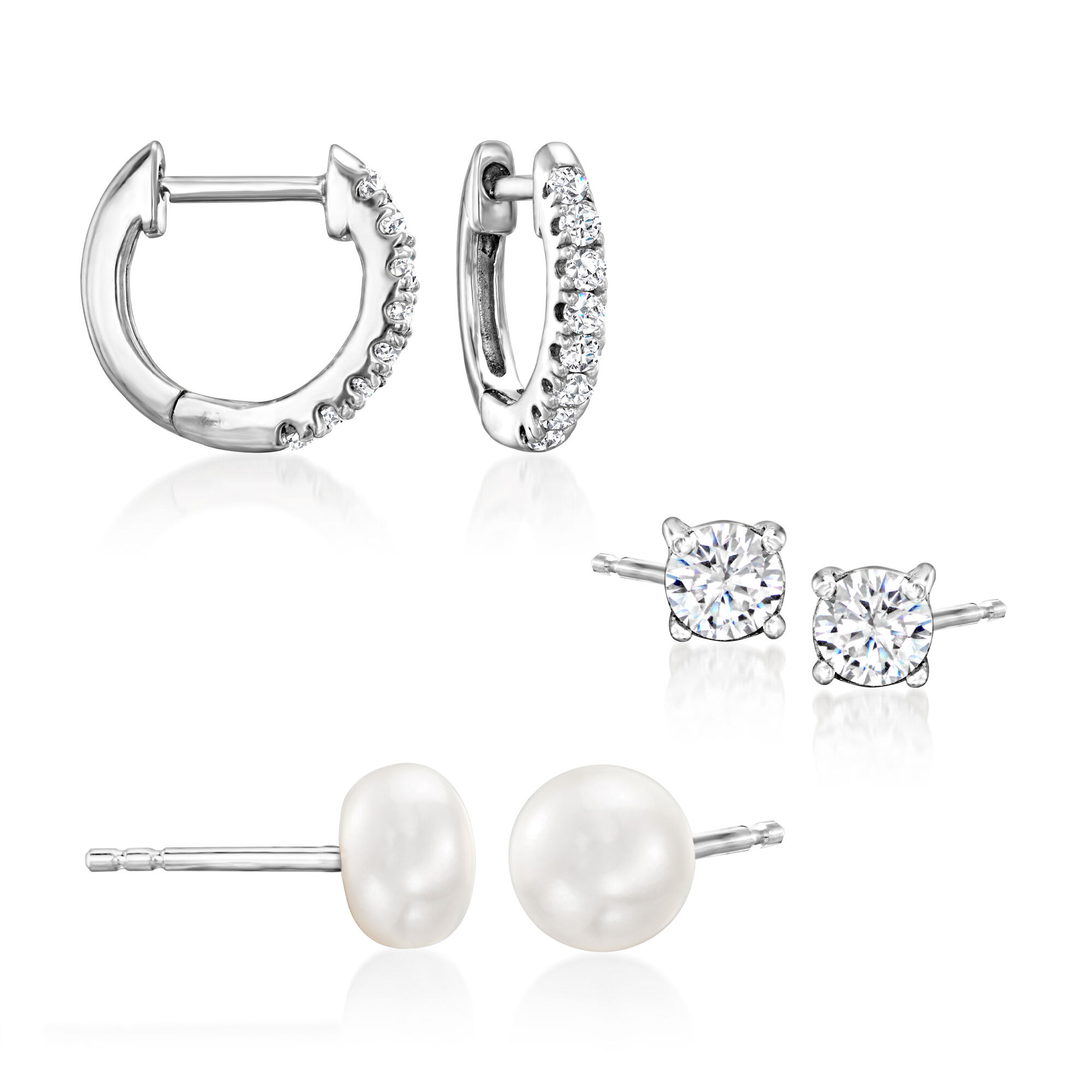 6-6.5mm Cultured Pearl and .60 ct. t.w. CZ Jewelry Set: Three Pairs of Earrings in Sterling Silver