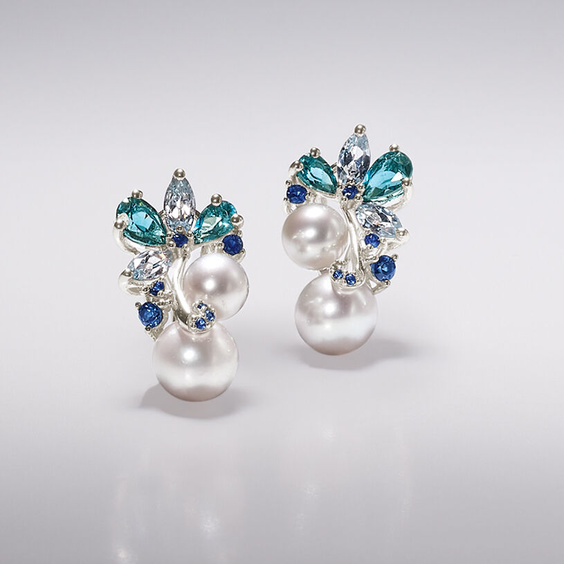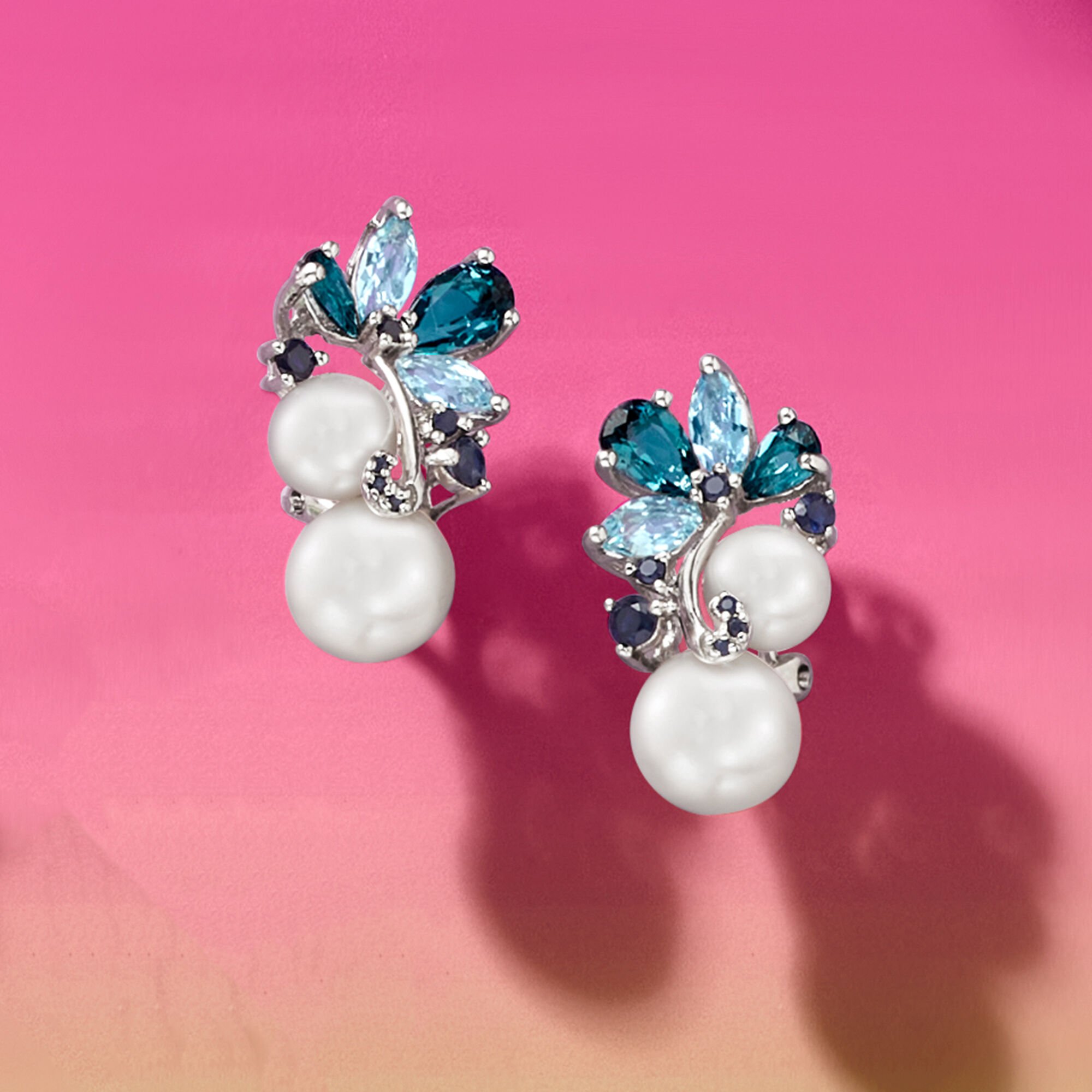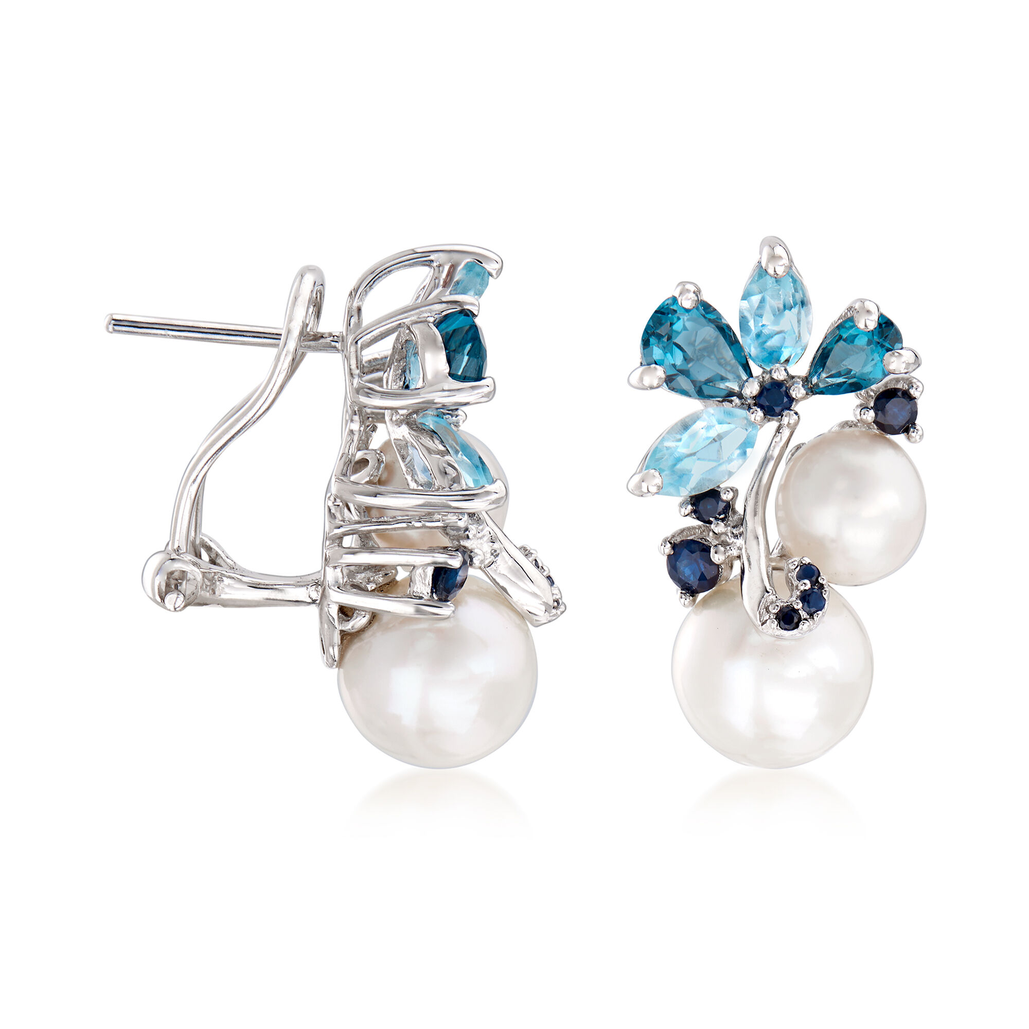 6-8.5mm Cultured Pearl and 2.00 ct. t.w. Sky Blue Topaz and London Blue Topaz Earrings with .10 ct. t.w. Sapphires in Sterling Silver