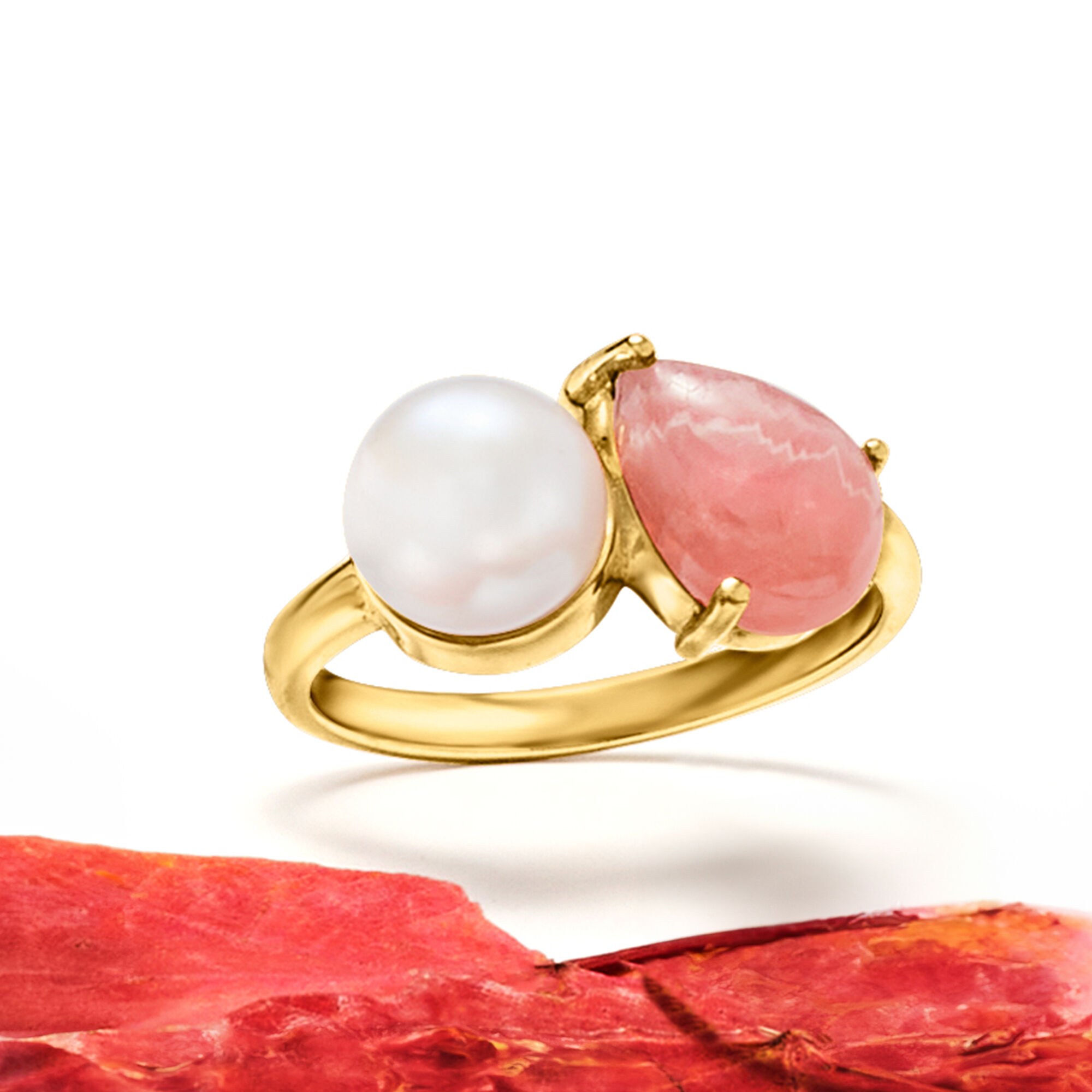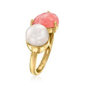 7.5-8mm Cultured Pearl and Pink Rhodochrosite Toi et Moi Ring in 18kt Gold Over Sterling