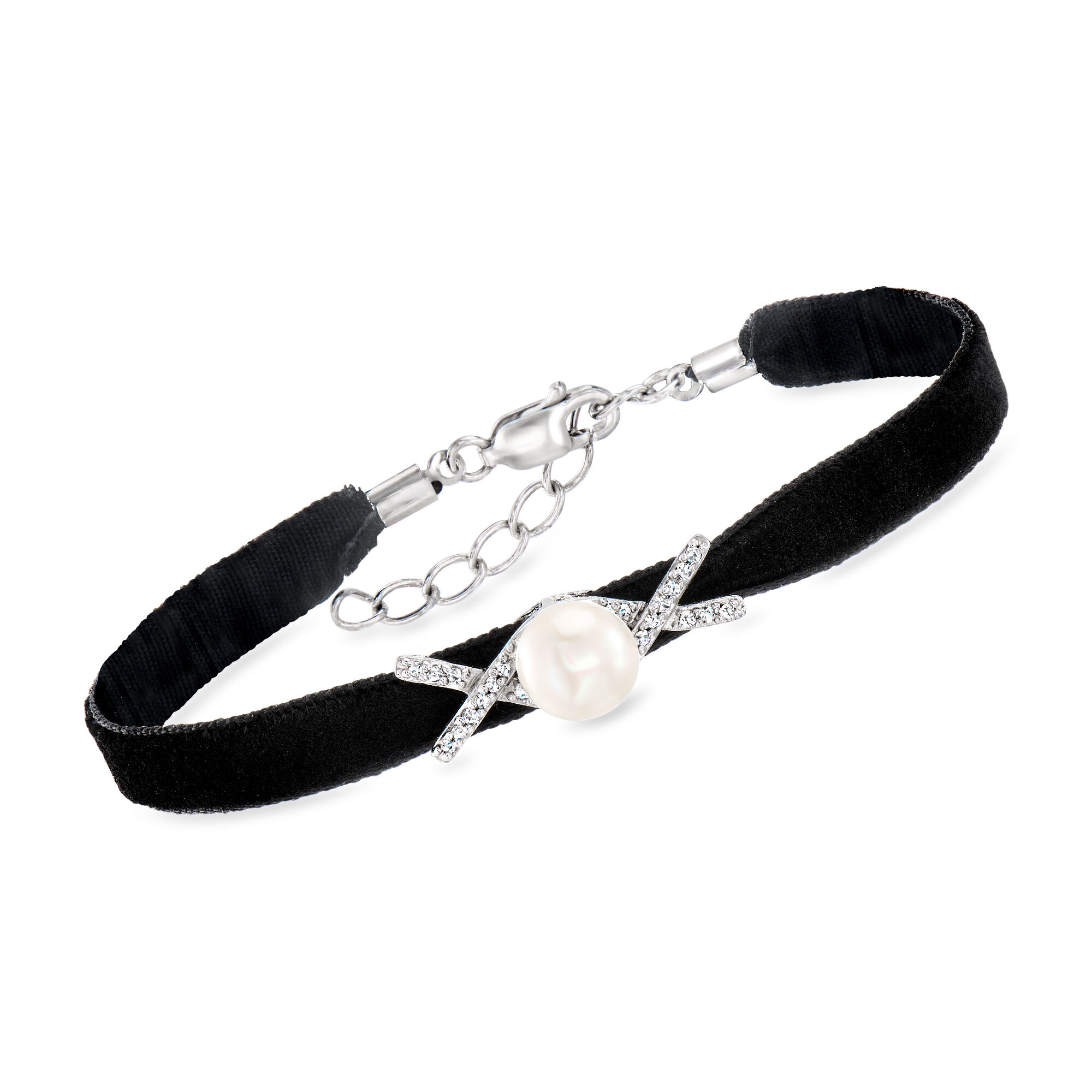 7-7.5mm Cultured Pearl Velvet Bracelet with Diamonds in Sterling Silver