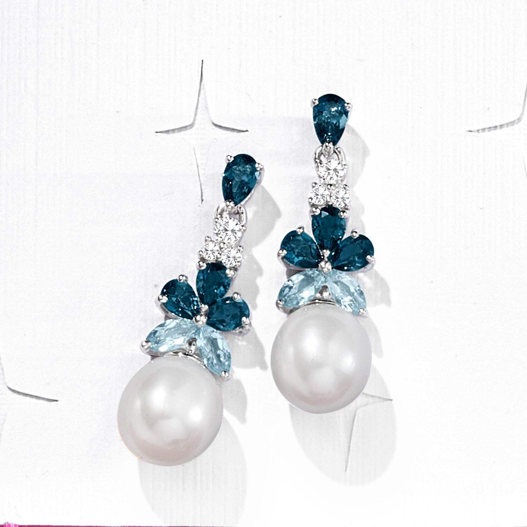 8.5-9mm Cultured Pearl and 2.30 ct. t.w. London, Sky Blue and White Topaz Drop Earrings in Sterling Silver