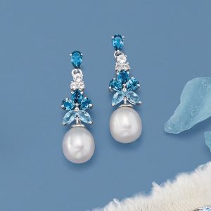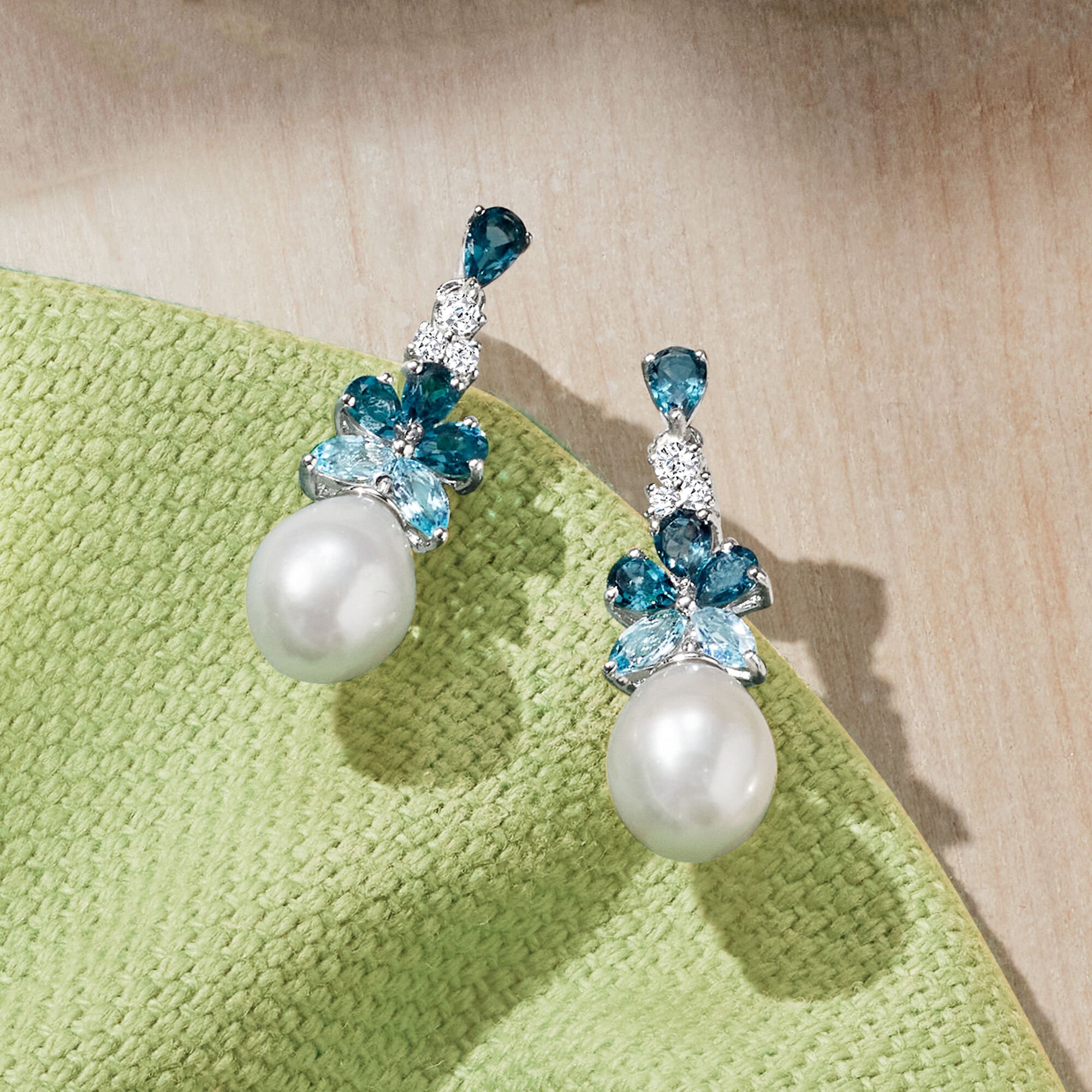 8.5-9mm Cultured Pearl and 2.30 ct. t.w. London, Sky Blue and White Topaz Drop Earrings in Sterling Silver
