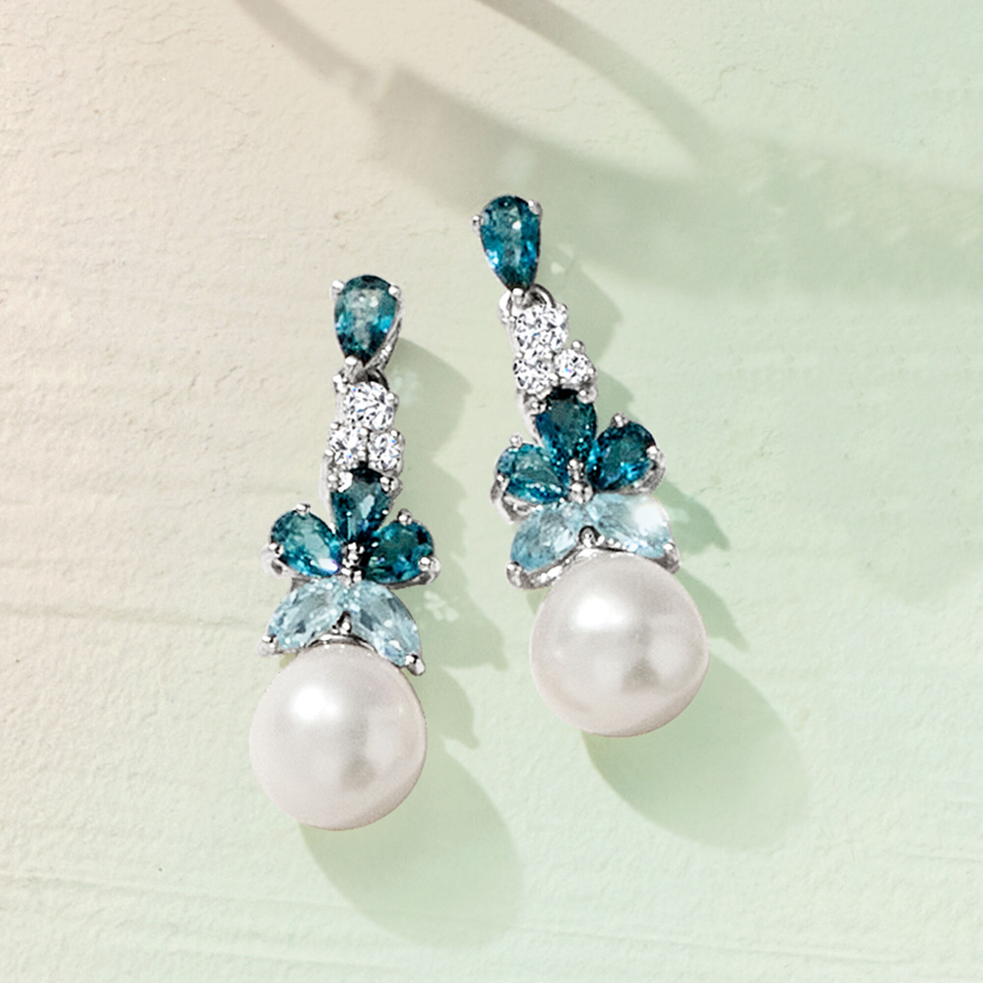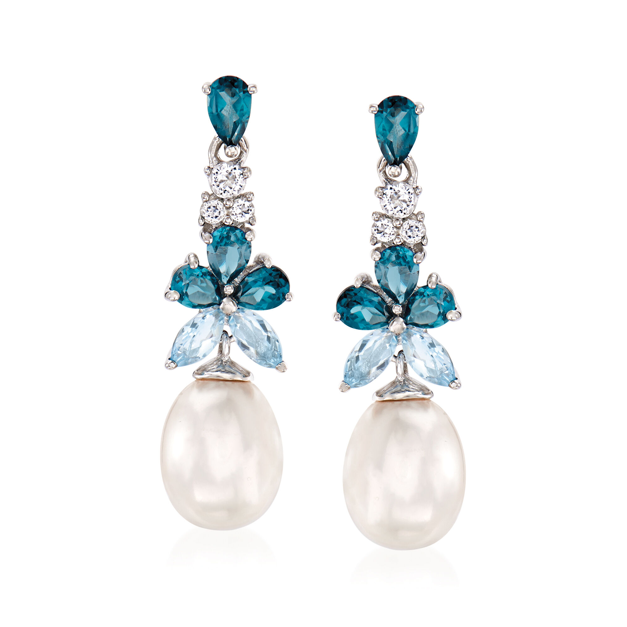 8.5-9mm Cultured Pearl and 2.30 ct. t.w. London, Sky Blue and White Topaz Drop Earrings in Sterling Silver