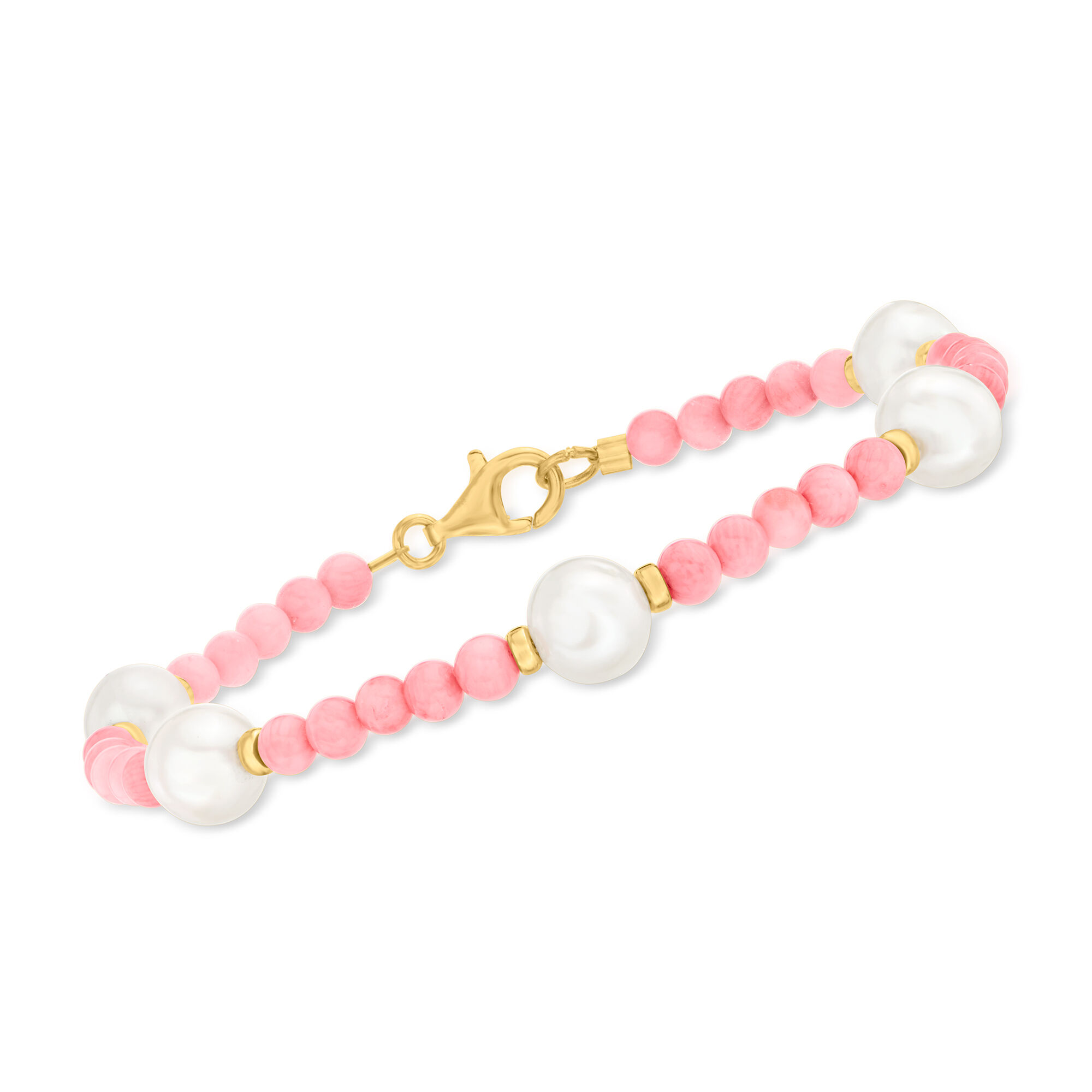 8.5-9mm Cultured Pearl and 4mm Pink Coral Bead Bracelet in 18kt Gold Over Sterling