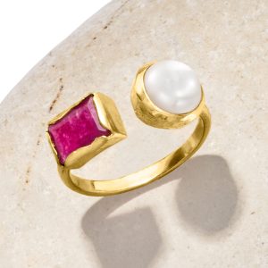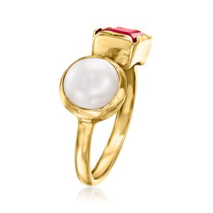 8-8.5mm Cultured Pearl and 1.50 Carat Pink Quartz Toi et Moi Ring in 18kt Gold Over Sterling