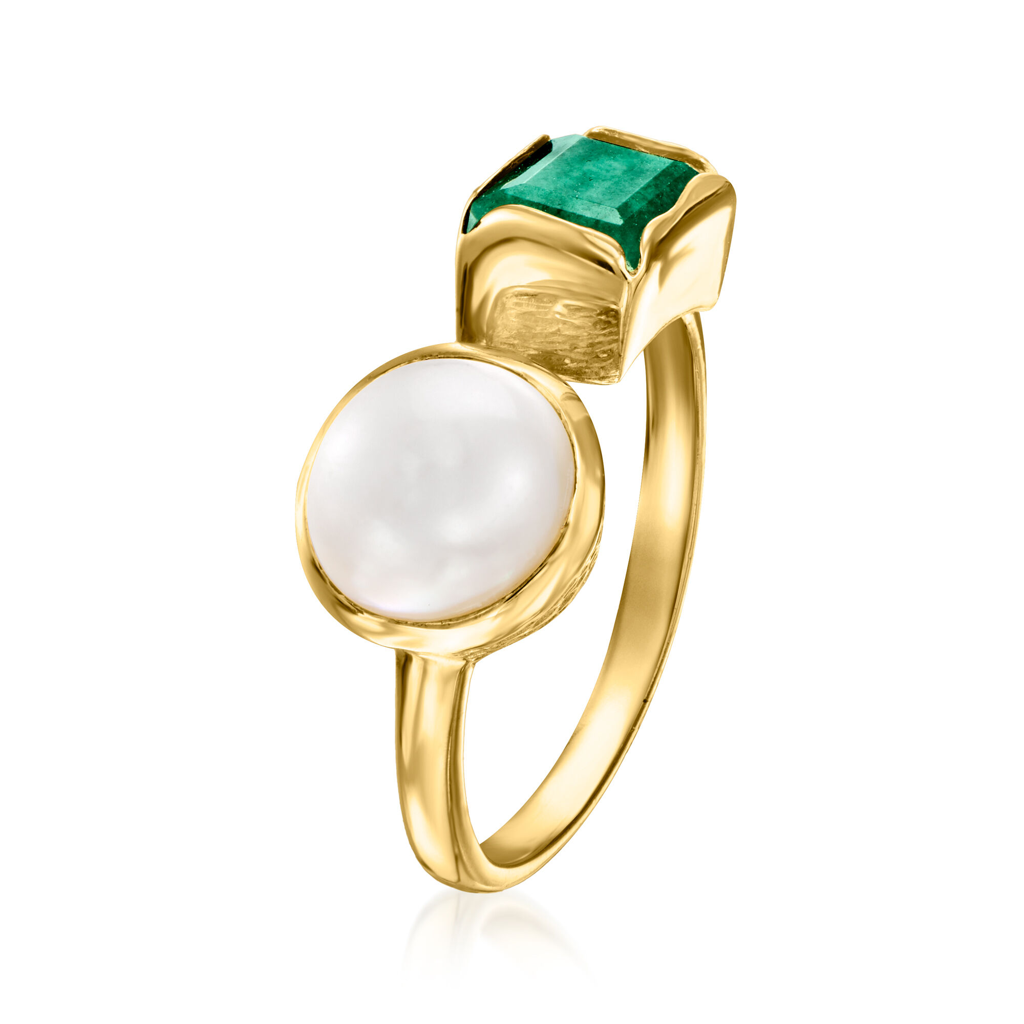 8-8.5mm Cultured Pearl and 1.90 Carat Emerald Toi et Moi Ring in 18kt Gold Over Sterling