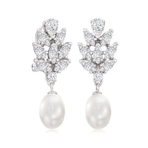 8-8.5mm Cultured Pearl and 3.30 ct. t.w. CZ Drop Earrings in Sterling Silver