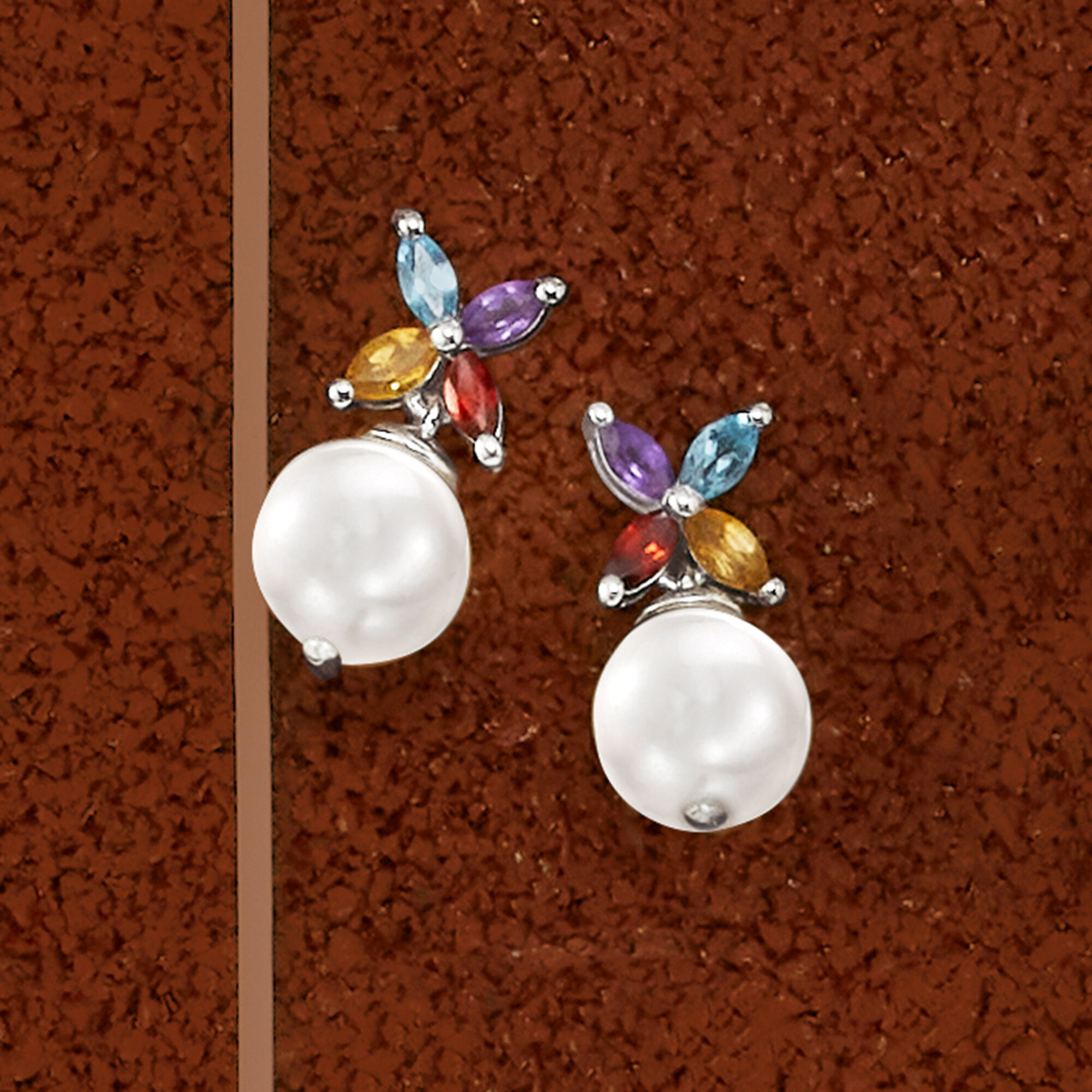 8-8.5mm Cultured Pearl and .40 ct. t.w. Multi-Gemstone Drop Earrings in Sterling Silver