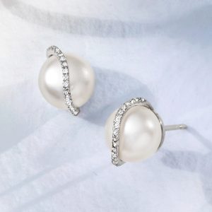 8-8.5mm Cultured Pearl and Diamond Swirl Earrings in Sterling Silver
