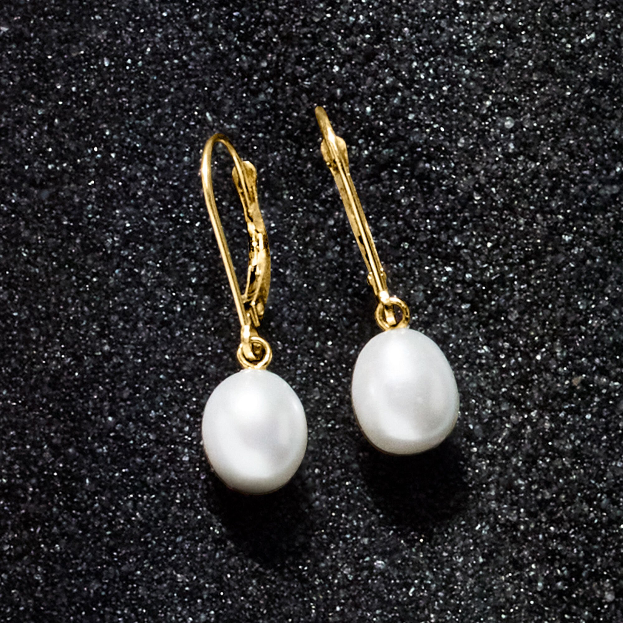 8-8.5mm Cultured Pearl Oval Drop Earrings in 14kt Yellow Gold
