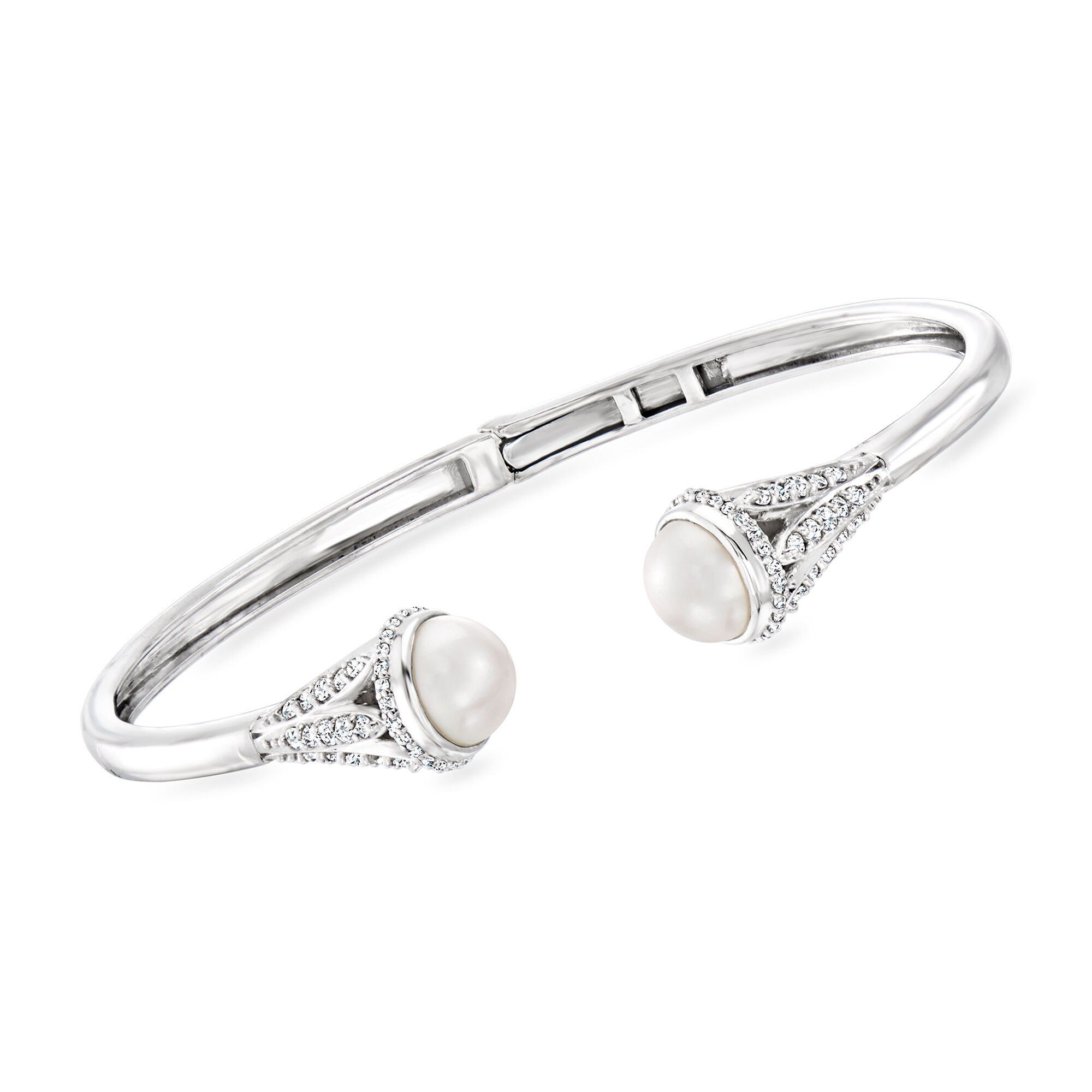 8mm Cultured Pearl and .80 ct. t.w. White Topaz Cuff Bracelet in Sterling Silver. 7″