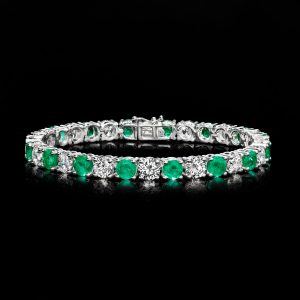 9.50 ct. t.w. Emerald and 10.00 ct. t.w. Lab-Grown Diamond Tennis Bracelet in 14kt White Gold. 7″