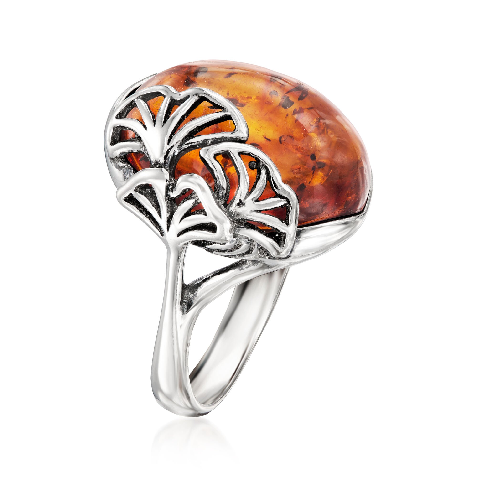 Amber Ginkgo Leaf Ring in Sterling Silver