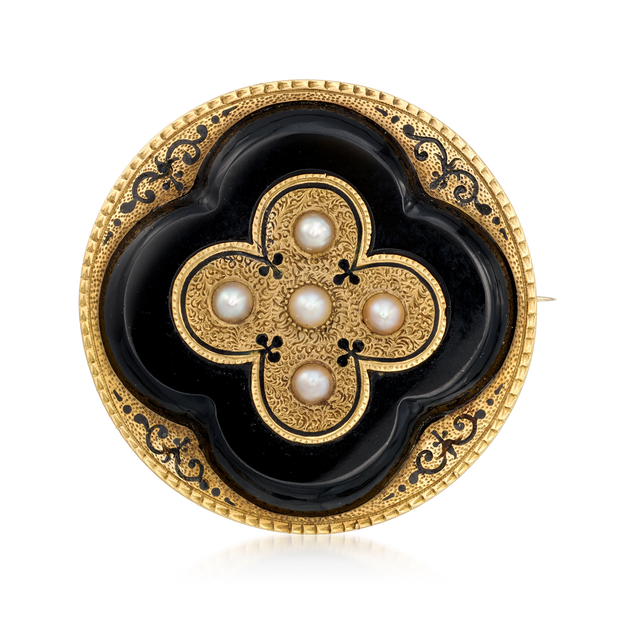 C. 1900 Vintage Onyx and 3.5mm Cultured Pearl Pin with Black Enamel in 14kt and 18kt Yellow Gold