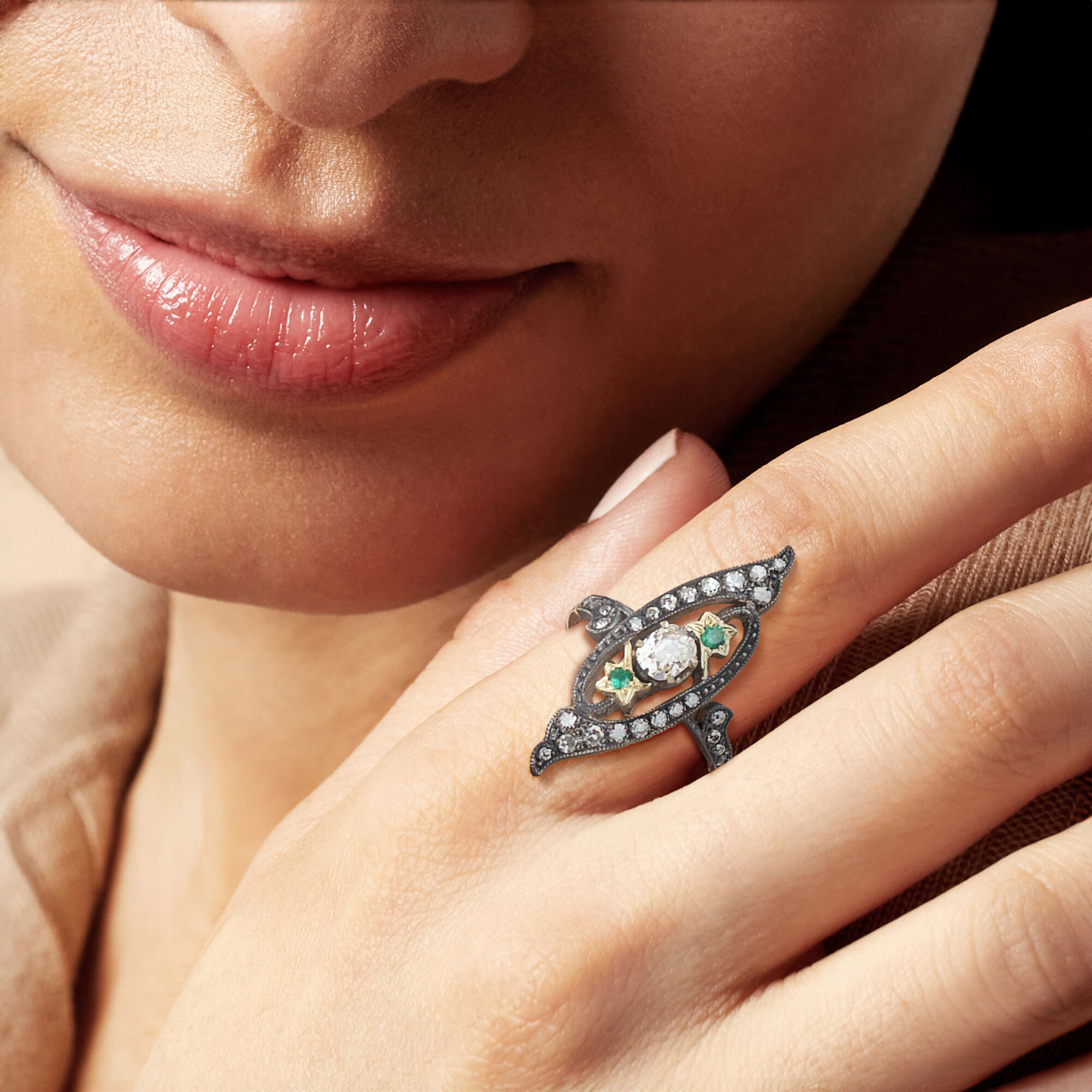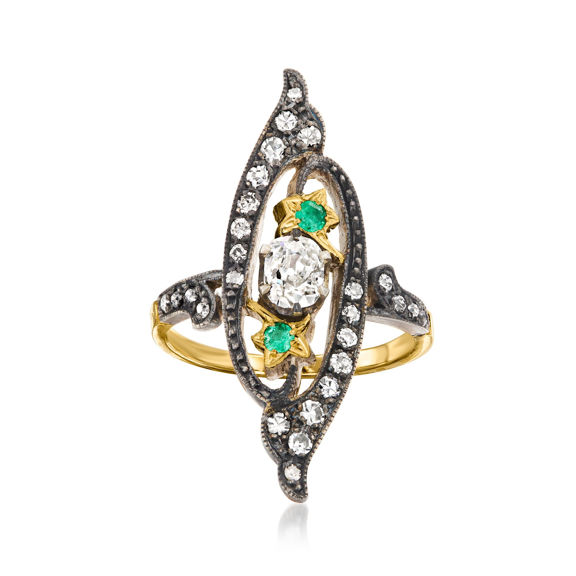 C. 1920 Vintage .95 ct. t.w. Diamond Ring with .10 ct. t.w. Emeralds in Sterling Silver and 18kt Yellow Gold. Size 7
