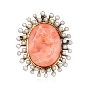 C. 1930 Vintage Coral Cameo Pin/Pendant with 2mm Cultured Pearls in 14kt Yellow Gold