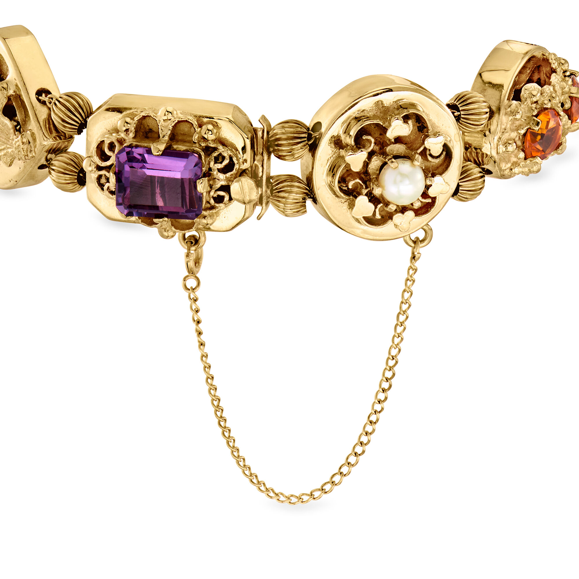C. 1950 Vintage 1.5-5.5mm Cultured Pearl and 9.91 ct. t.w. Multi-Gemstone Slide Bracelet in 14kt Yellow Gold. 7″