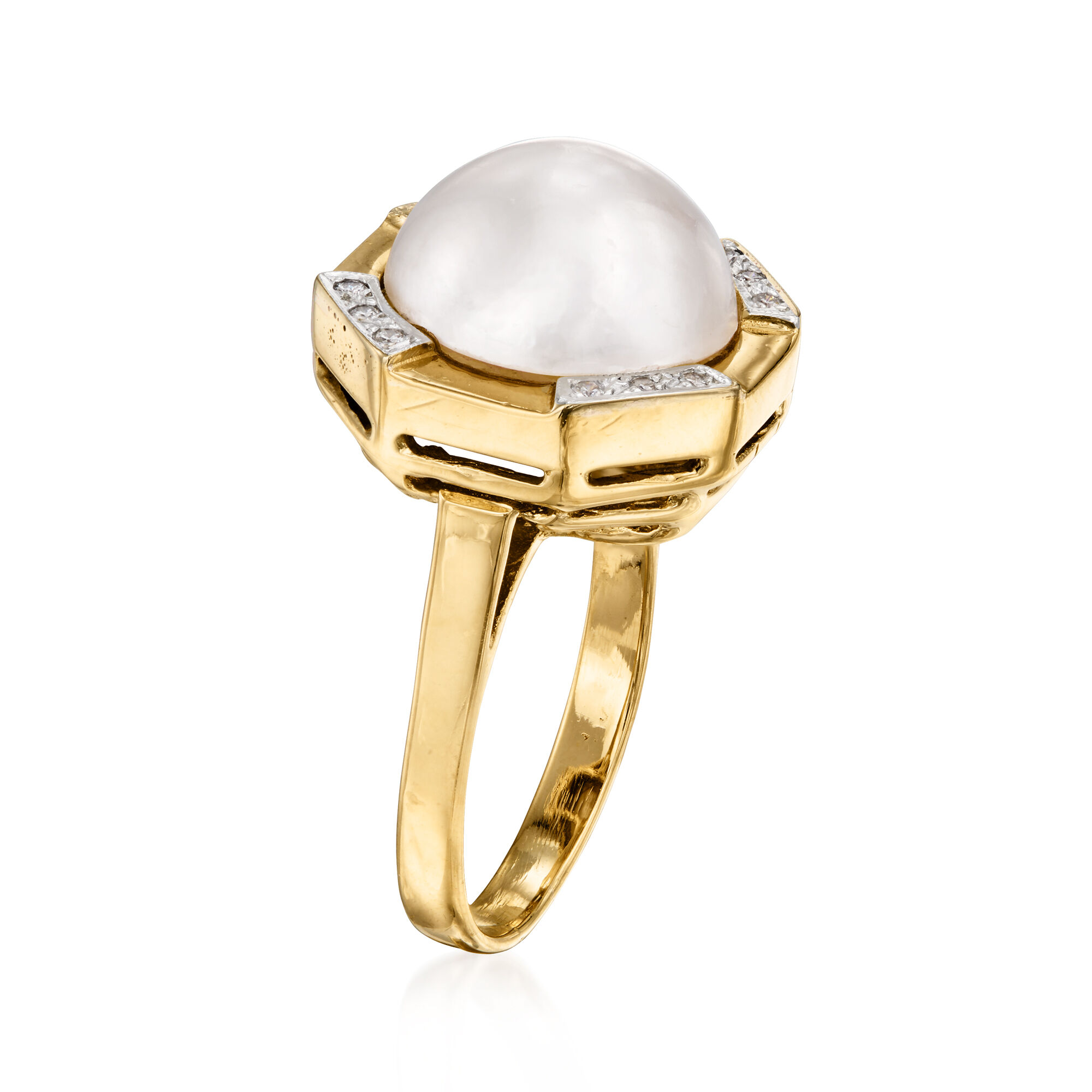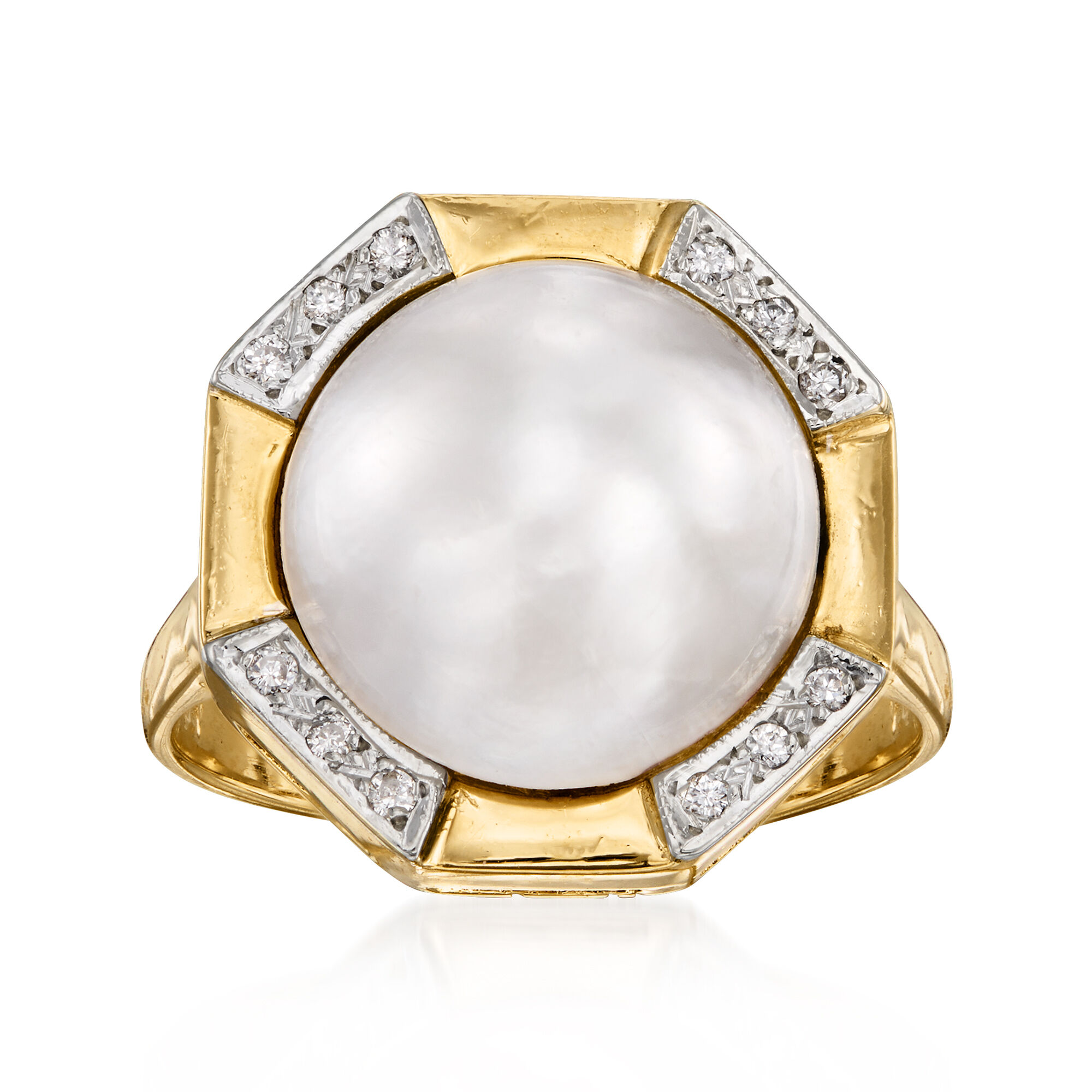 C. 1980 Vintage 12mm Cultured Mabe Pearl Ring with Diamonds in 14kt Yellow Gold. Size 6.5