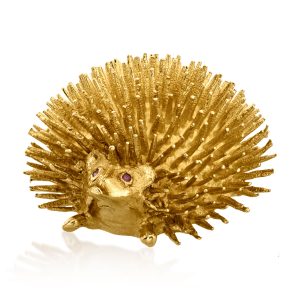 C. 1980 Vintage 14kt Yellow Gold Hedgehog Pin with Rubies