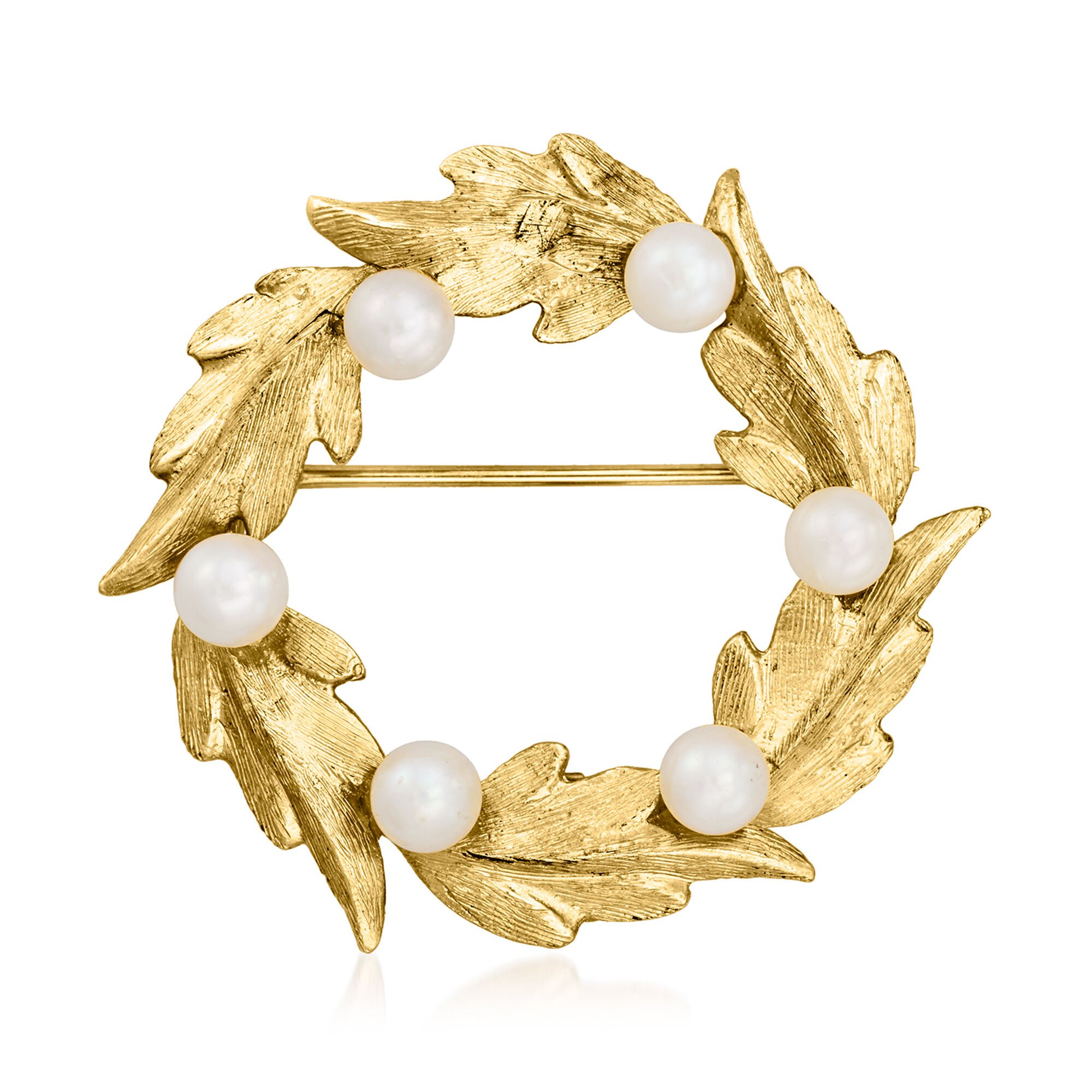 C. 1980 Vintage 4mm Cultured Pearl Leaf Circle Pin in 14kt Yellow Gold