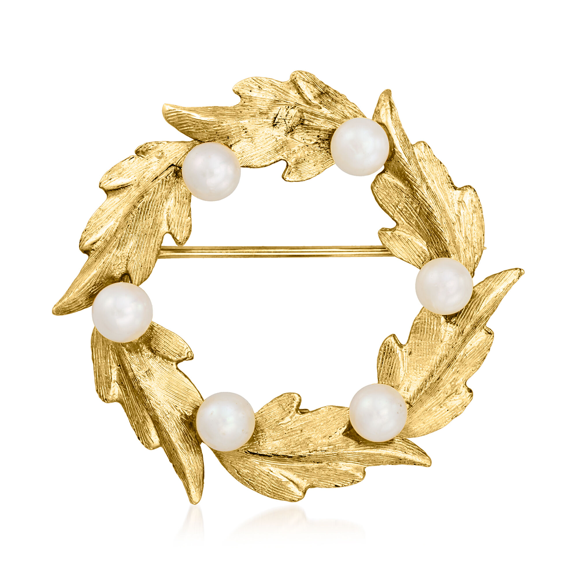 C. 1980 Vintage 4mm Cultured Pearl Leaf Circle Pin in 14kt Yellow Gold