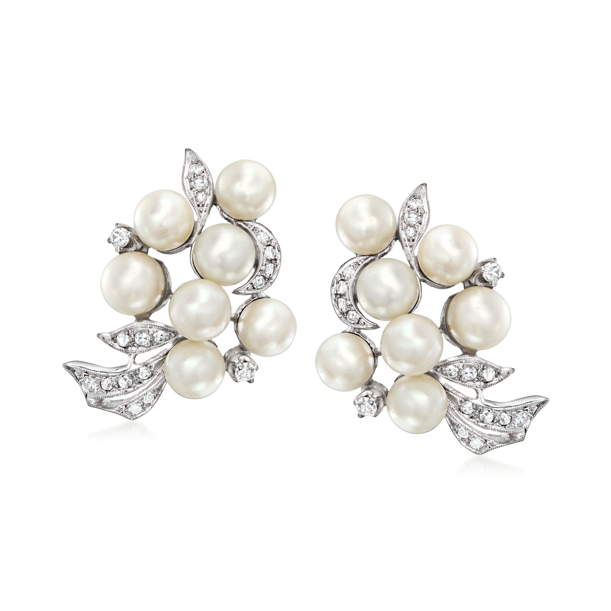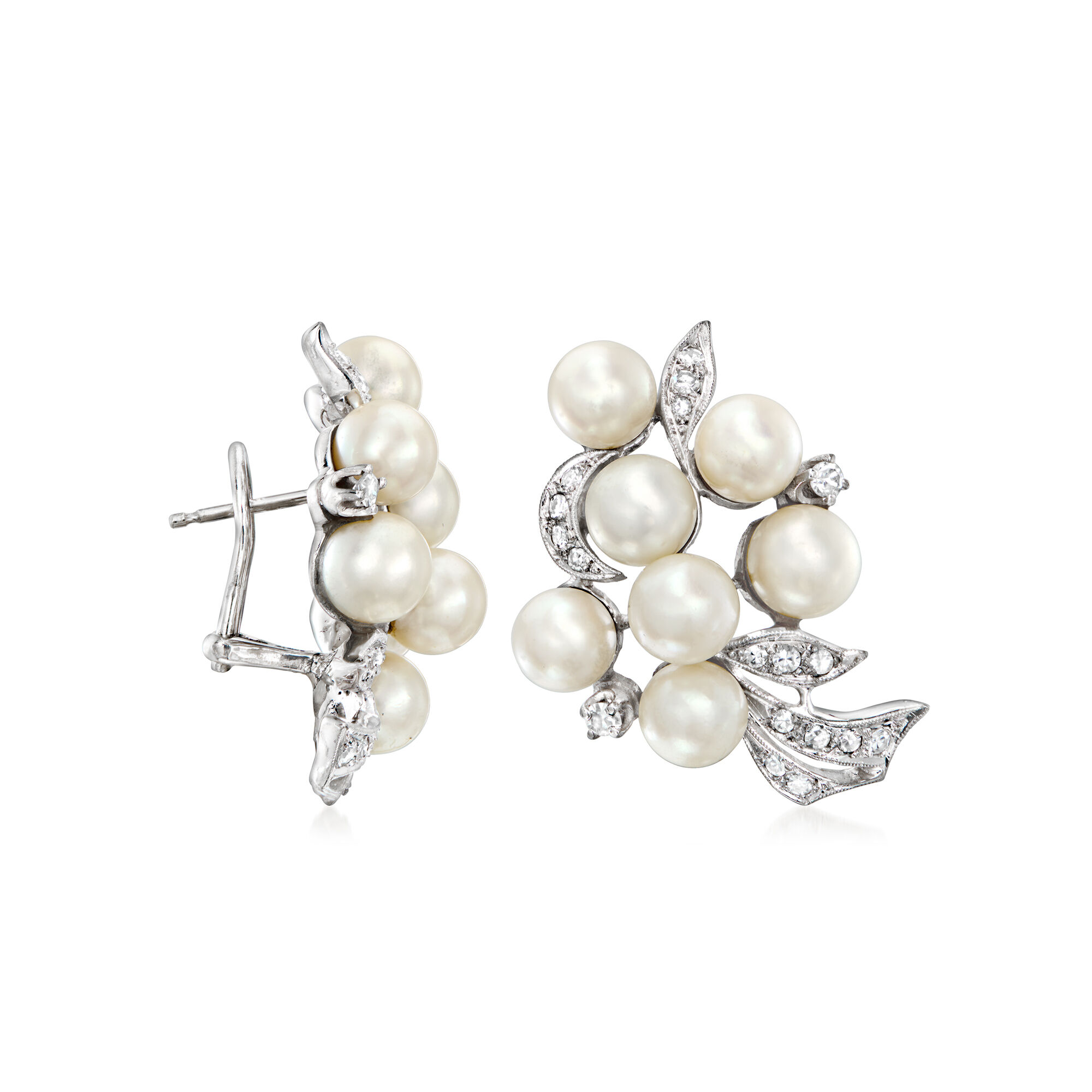 C. 1980 Vintage 6.5mm Cultured Pearl and .75 ct. t.w. Diamond Earrings in 14kt White Gold