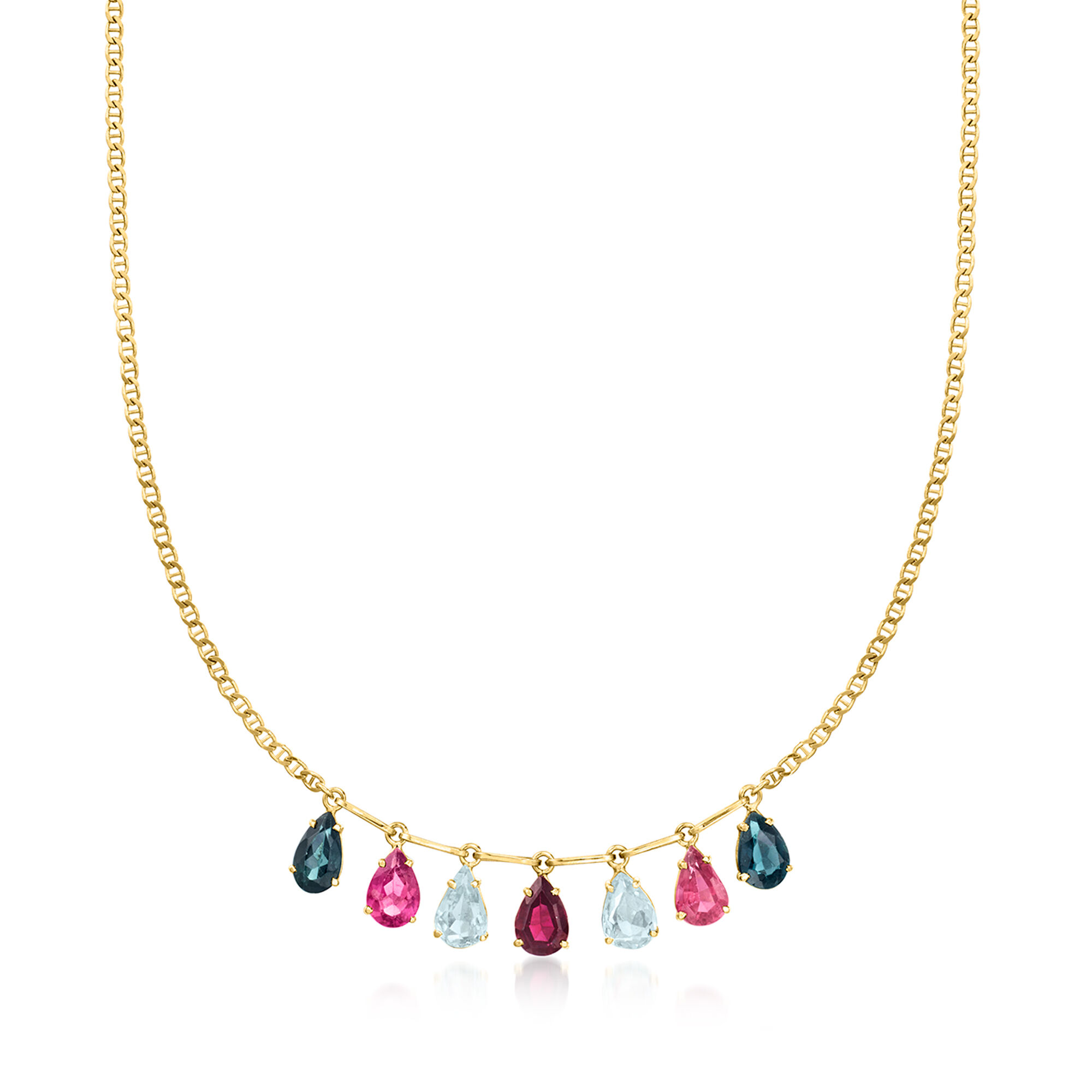 C. 1980 Vintage 8.45 ct. t.w. Multi-Gemstone Drop Necklace in 14kt Yellow Gold. 19″