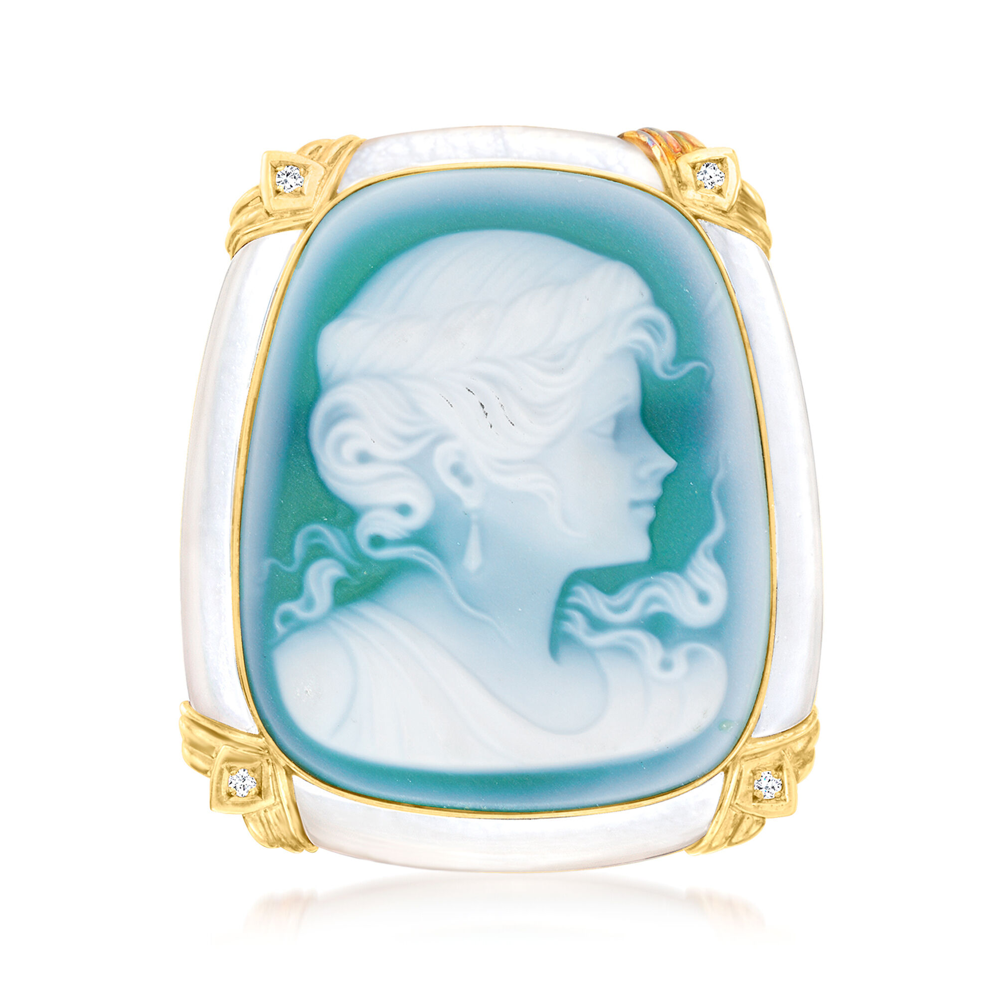 C. 1980 Vintage Blue Agate and Mother-of-Pearl Cameo Pin/Pendant with Diamonds in 18kt Yellow Gold