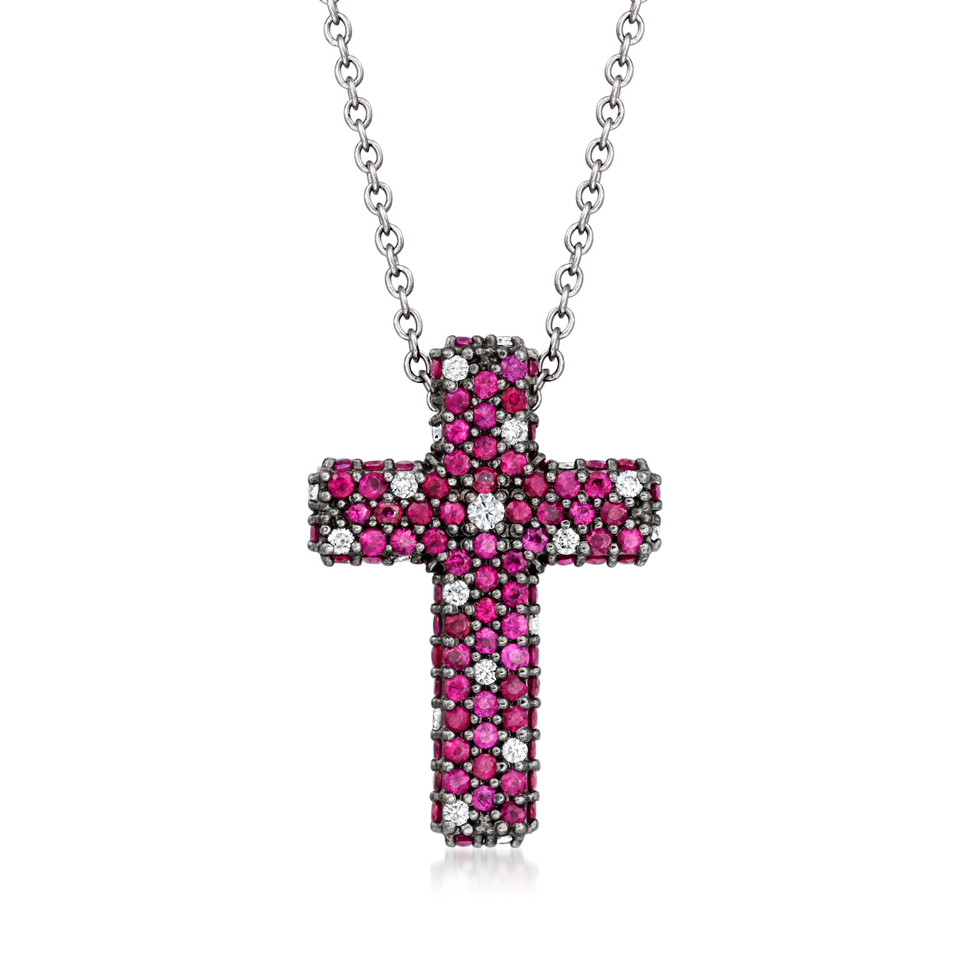 C. 1990 Vintage 1.30 ct. t.w. Ruby and .21 ct. t.w. Diamond Cross Necklace in 18kt White Gold. 16.5″
