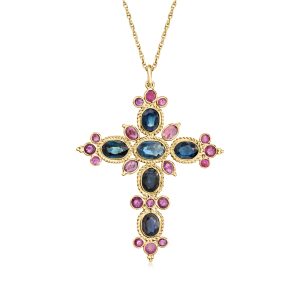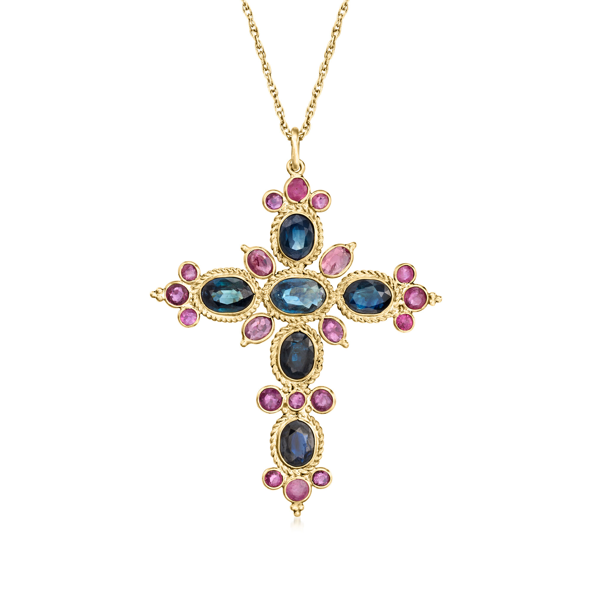C. 1990 Vintage 2.40 ct. t.w. Sapphire and 1.20 ct. t.w. Ruby Cross Pendant Necklace in 14kt Yellow Gold. 18″